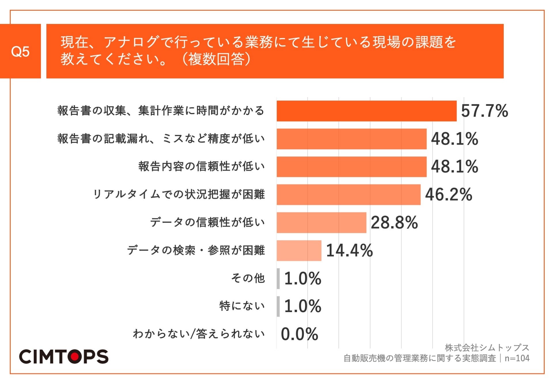 Q2で「アナログな業務はない」「わからない/答えられない」以外を回答した方に、「Q5.現在、アナログで行っている業務にて生じている現場の課題を教えてください。(複数回答)」(n=104)と質問したところ、「報告書の収集、集計作業に時間がかかる」が57.7%、「報告書の記載漏れ、ミスなど精度が低い」が48.1%、「報告内容の信頼性が低い」が48.1%という回答となりました。
