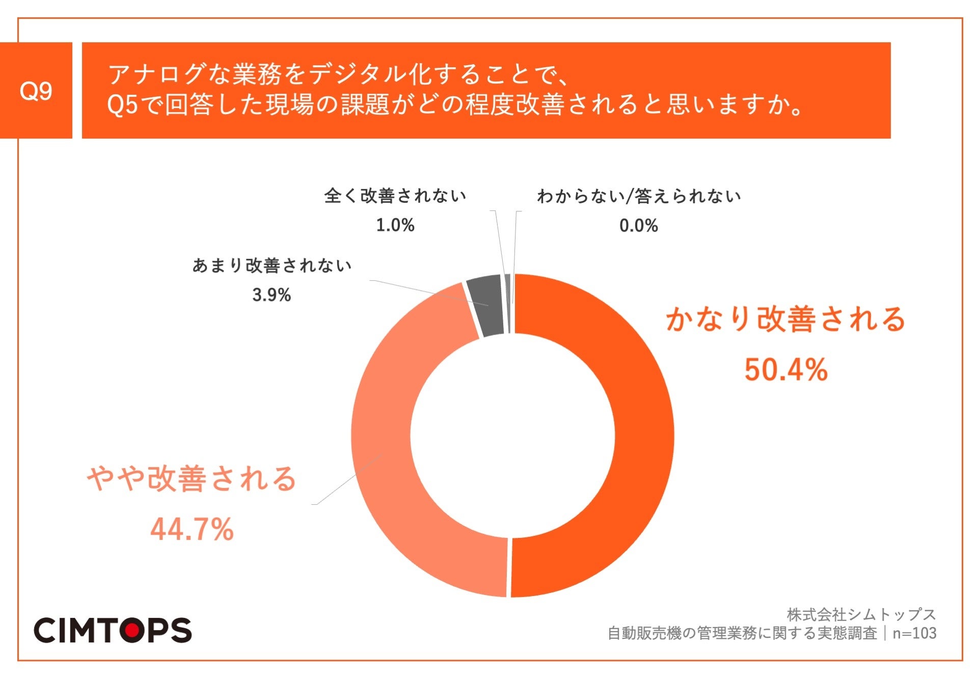 Q5で「特にない」「わからない/答えられない」以外を回答した方に、「Q9.アナログな業務をデジタル化することで、Q5で回答した現場の課題がどの程度改善されると思いますか。」(n=103)と質問したところ、「かなり改善される」が50.4%、「やや改善される」が44.7%という回答となりました。