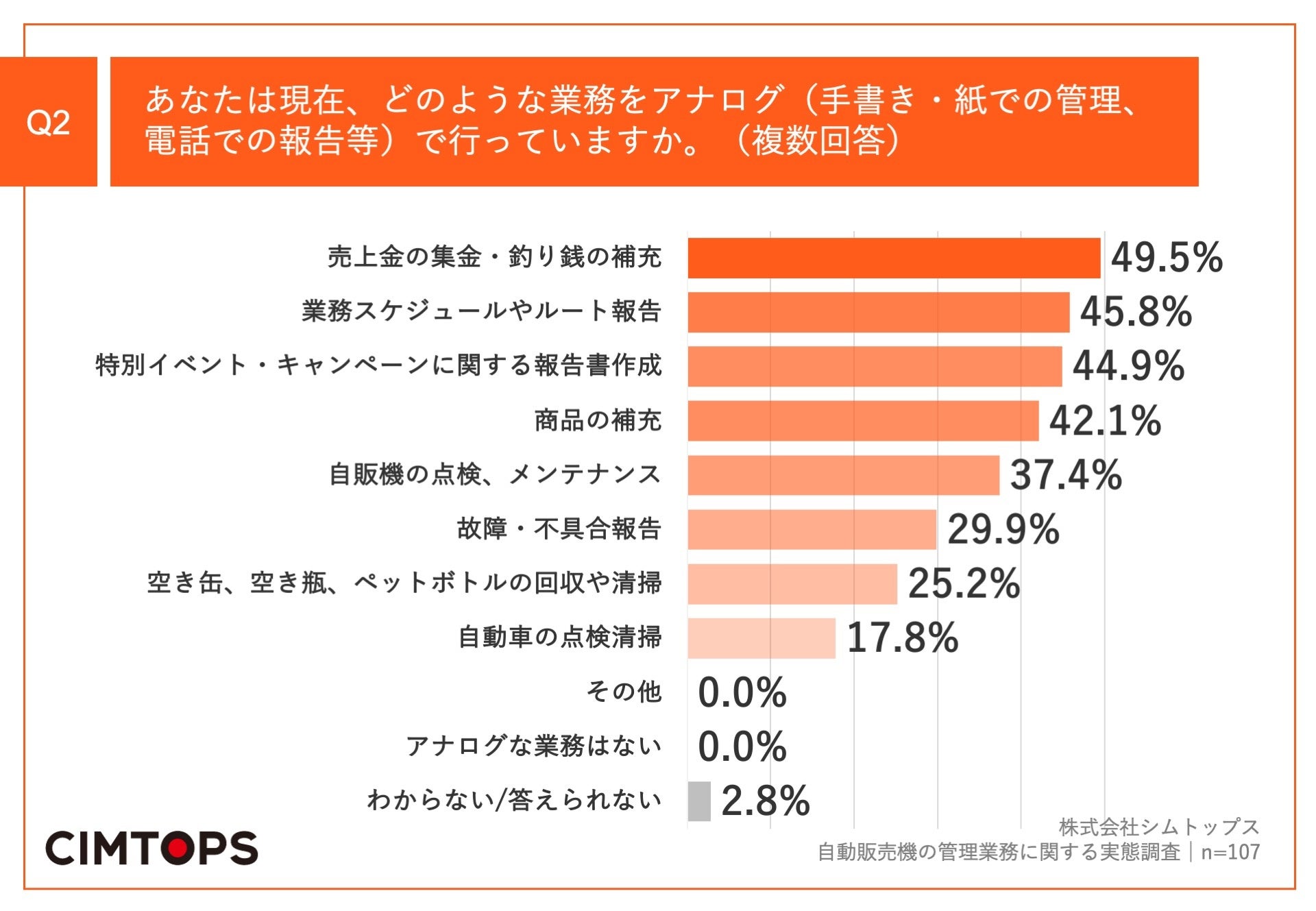「Q2.あなたは現在、どのような業務をアナログ(手書き・紙での管理、電話での報告等)で行っていますか。(複数回答)」(n=107)と質問したところ、「売上金の集金・釣り銭の補充」が49.5%、「業務スケジュールやルート報告」が45.8%、「特別イベント・キャンペーンに関する報告書作成」が44.9%という回答となりました。