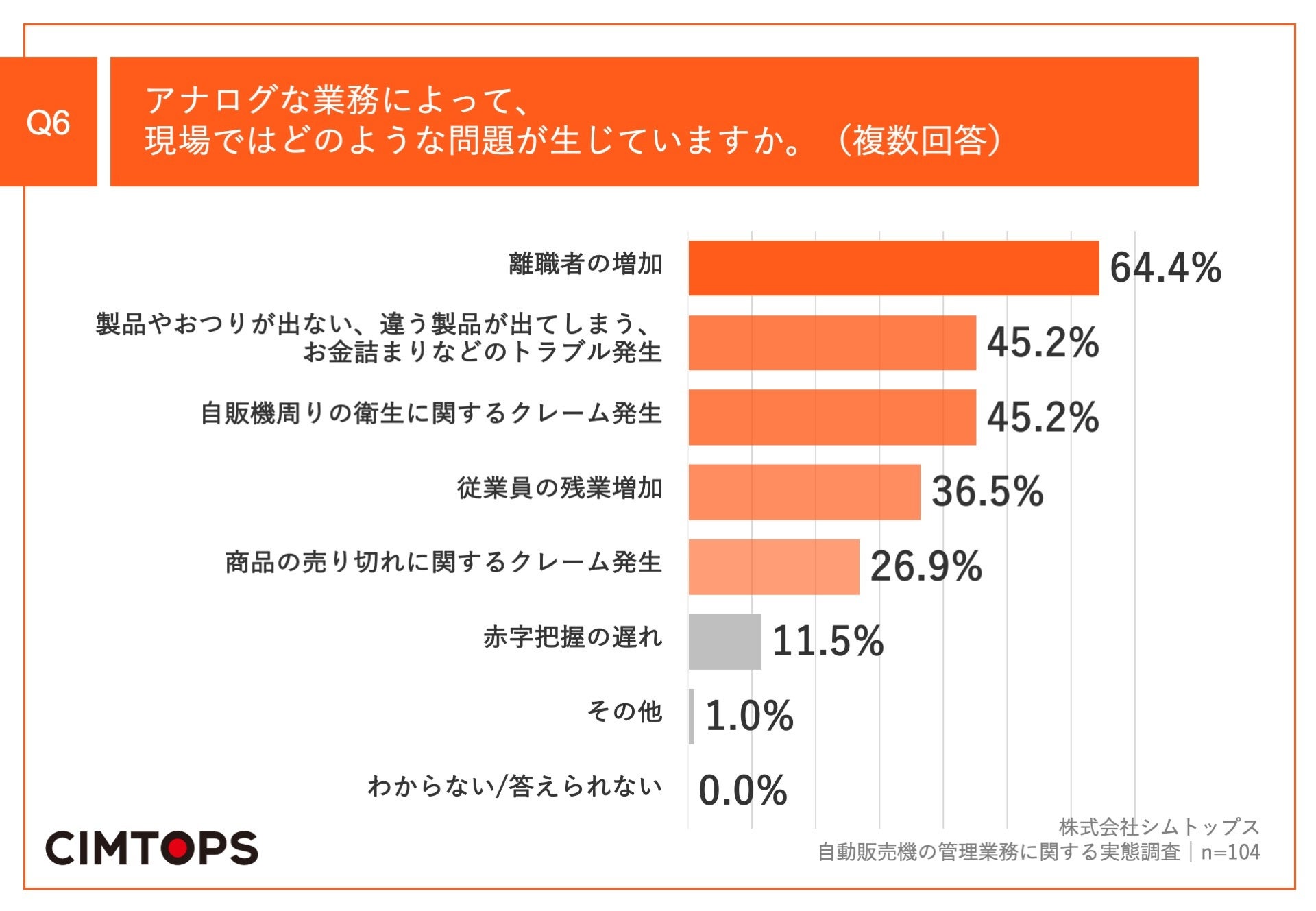 Q2で「アナログな業務はない」「わからない/答えられない」以外を回答した方に、「Q6.アナログな業務によって、現場ではどのような問題が生じていますか。(複数回答)」(n=104)と質問したところ、「離職者の増加」が64.4%、「製品やおつりが出ない、違う製品が出てしまう、お金詰まりなどのトラブル発生」が45.2%、「自販機周りの衛生に関するクレーム発生」が45.2%という回答となりました。