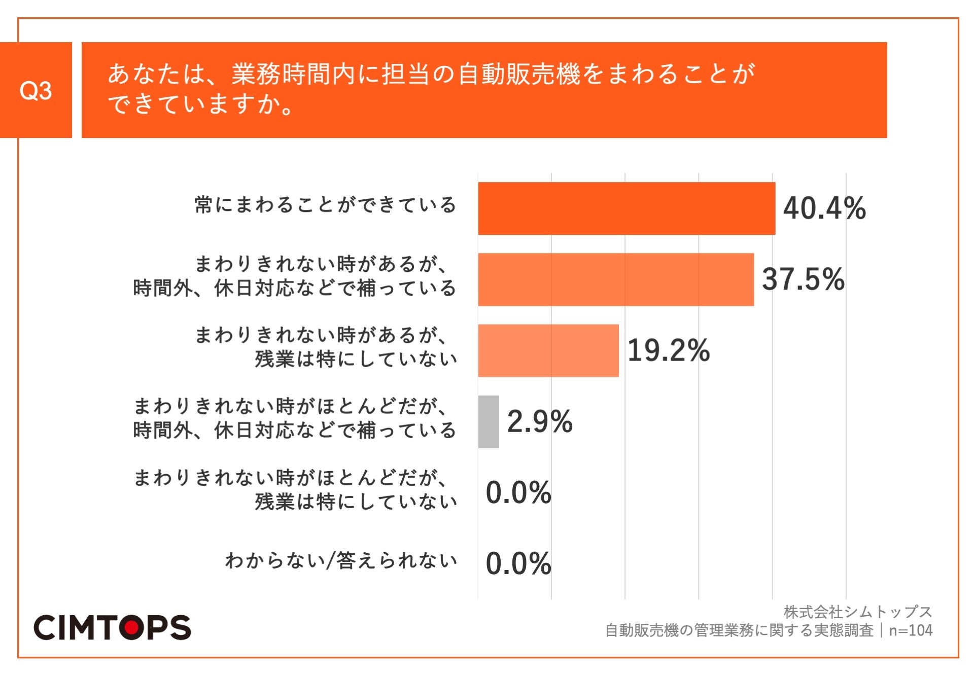 Q2で「アナログな業務はない」「わからない/答えられない」以外を回答した方に、「Q3.あなたは、業務時間内に担当の自動販売機をまわることができていますか。」(n=104)と質問したところ、「常にまわることができている」が40.4%、「まわりきれない時があるが、時間外、休日対応などで補っている」が37.5%、「まわりきれない時があるが、残業は特にしていない」が19.2%という回答となりました。