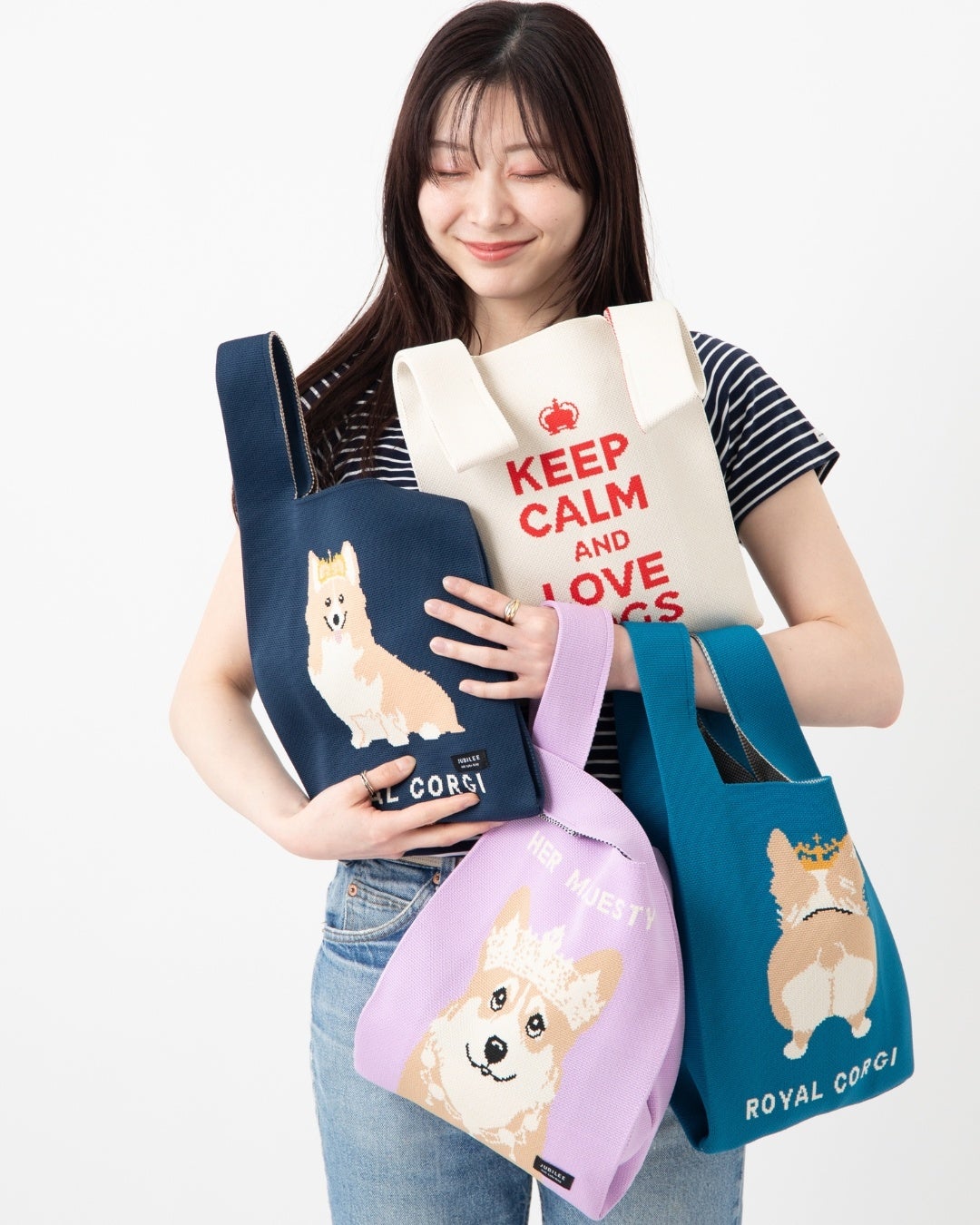 ロイヤルドッグである愛らしいコーギーがモチーフとなった、トレンドのニット素材トートバッグ。