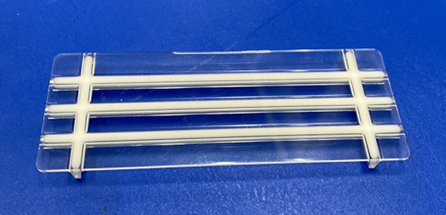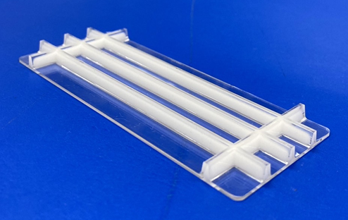 部分リブ発泡成形技術デモンストレーションサンプル(白色部分発泡リブ、大きさ3×8cm、汎用ポリカーボネート(PC))