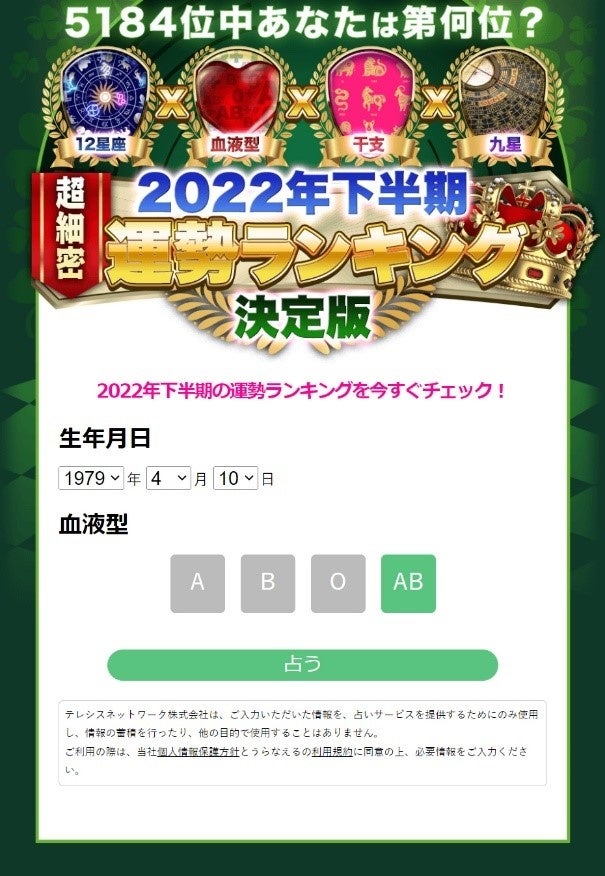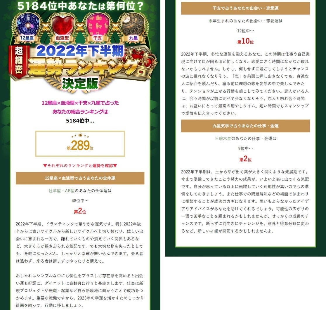 ・コンテンツ名称:『2022年下半期の運勢ランキング』全5184位中あなたの運勢は何位?