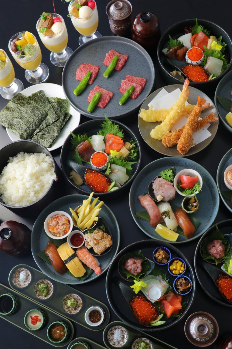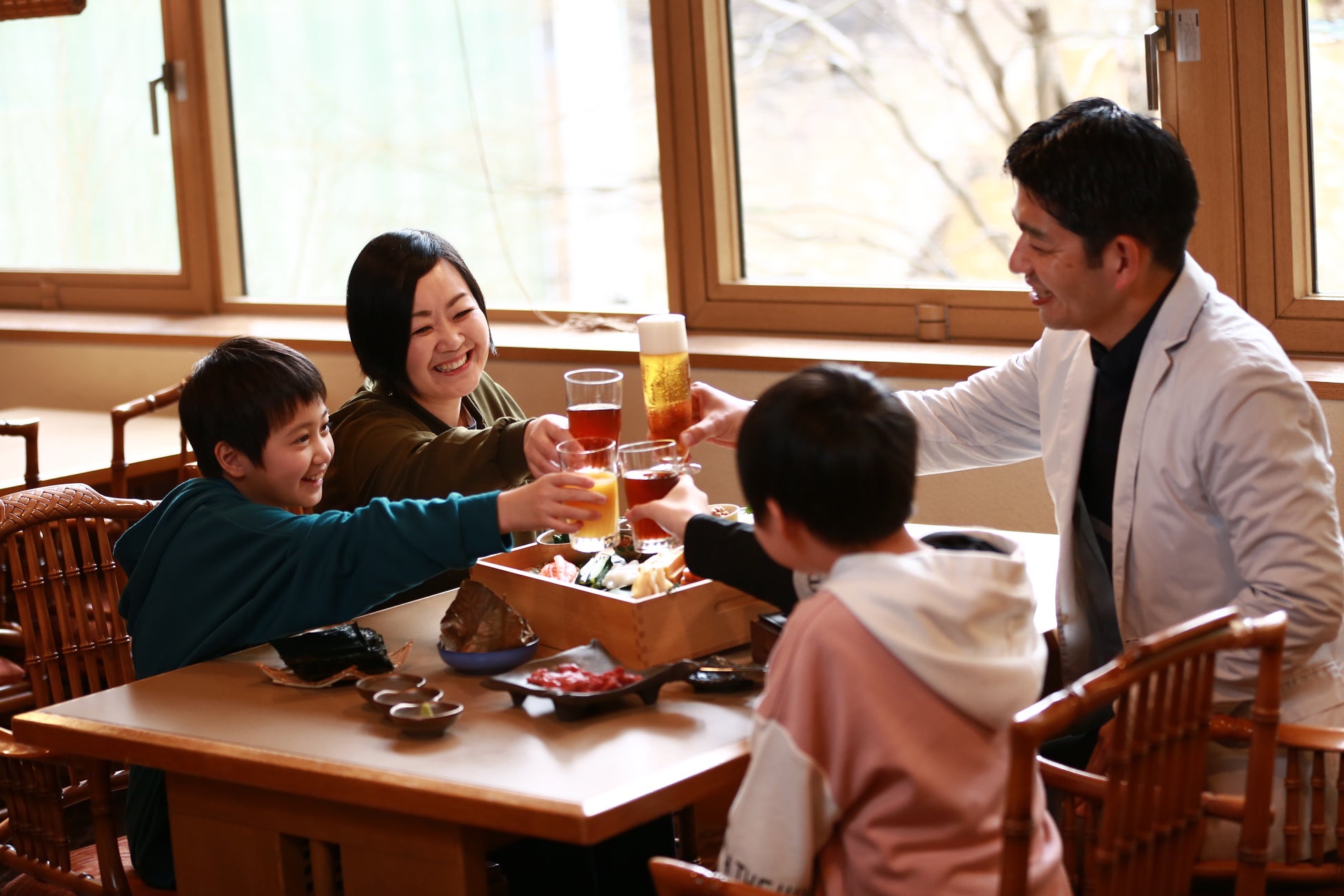 夕食は、ホテル館内の日本料理『華雲』にて、お客様ご自身でお好みの具材を巻いて楽しむ手巻き寿司スタイルで、トラウトサーモン、いくらなど大人と子供あわせて15種類以上の具材をご用意。十人十色の組み合わせで素材の旨味を存分に味わえます。料理長おすすめのイカ×とびこ、飛騨牛×飛騨産味噌といった、組み合わせもぜひお試しください。さらに、A5等級の飛騨牛や握り寿司、特製和風パフェもお楽しみいただけます。お子様メニューは人気の玉子や海老フライ、唐揚げもご用意。
