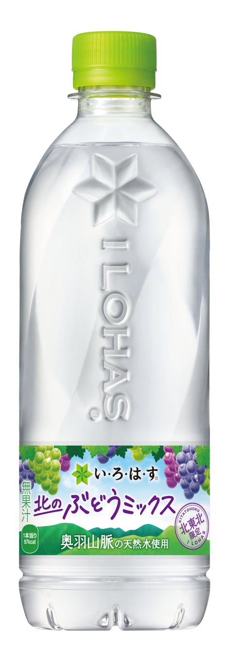 「い·ろ·は·す」フレーバーウォーターは、厳選された日本の天然水に、日本各地のくだもののエキスを配合したシリーズで、すっきりとしたほのかな甘さとフレーバーで幅広いお客様に支持されています。「い・ろ・は・す 北のぶどうミックス」は、素材にこだわり厳選された奥羽山脈の天然水に、青森県産「スチューベン」、秋田県産「ナイアガラ」、岩手県産「キャンベル」のぶどうエキスを使用し、芳醇な香りとジューシーな後味をお楽しみいただけます。