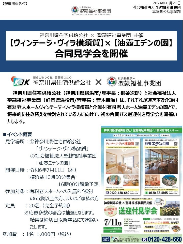 神奈川県住宅供給公社(神奈川県横浜市/理事長:桐谷次郎)と社会福祉法人聖隷福祉事業団(静岡県浜松市/理事長:青木善治)は、それぞれが運営する介護付有料老人ホームヴィンテージ・ヴィラ横須賀と介護付有料老人ホーム油壺エデンの園とで、将来的に住み替えを検討されている方に向けて、初の合同バス送迎付き見学会を開催いたします。