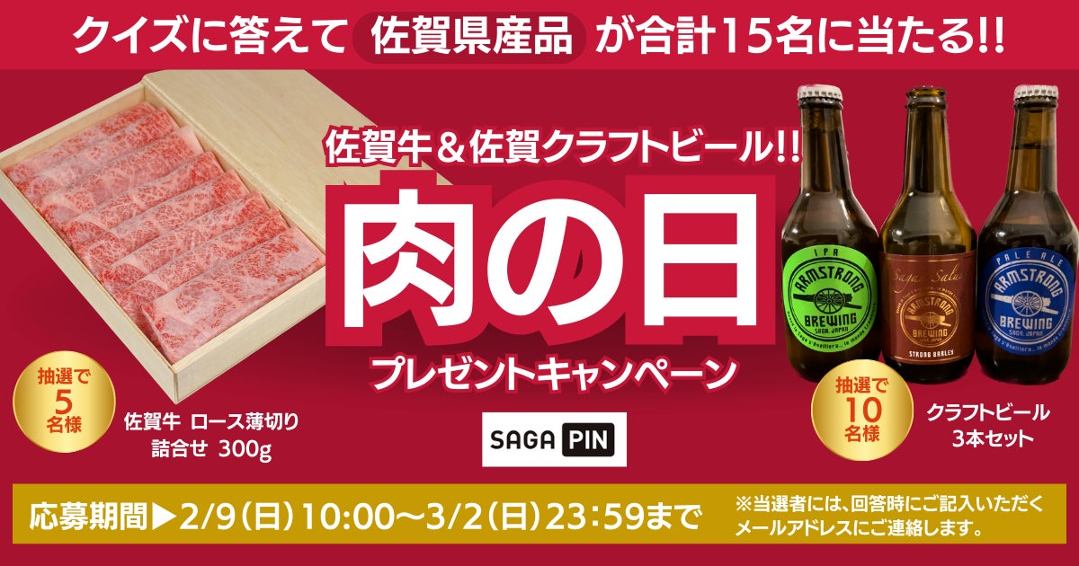 さが県産品流通デザイン公社は、佐賀県産品の紹介サイト「SAGAPIN(さがぴん)」にて、2025年2月9日(日曜日)から3月2日(日曜日)まで、「SAGAPIN」内のクイズに答えて、抽選で15名様に佐賀県産品(佐賀牛、佐賀県クラフトビール)が当たるプレゼントキャンペーンを実施いたします。