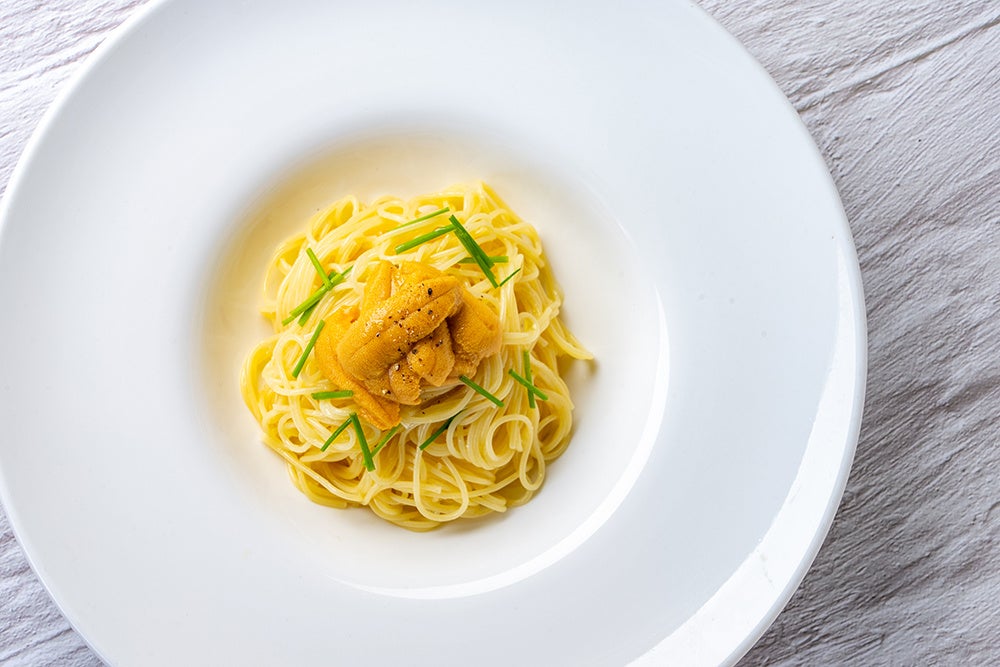 本年も、北海道から直送される希少な塩水ウニを惜しみなく使用し、極細カペッリーニに帆立と昆布の旨みだしを合わせた、香り高く贅沢な冷製パスタに仕上げました。
