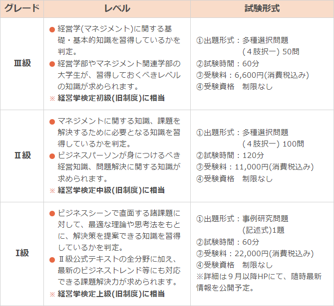 マネジメントに関する基礎・専門的知識、経営課題解決能力が一定水準に達していることを全国レベルで資格認定する検定試験です。マネジメント検定(旧 経営学検定)は2023年4月より試験制度が改訂され、試験級が「Ⅲ級」「Ⅱ級」「Ⅰ級」となりました。(最上位の「マスター」は2024年以降に新設予定です)