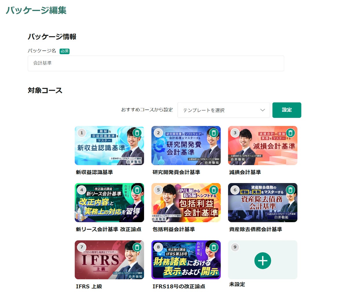 任意の講座を組み合わせた独自のカリキュラム(パッケージ)を作成可能。テーマ別の学習状況も一目で把握できます。