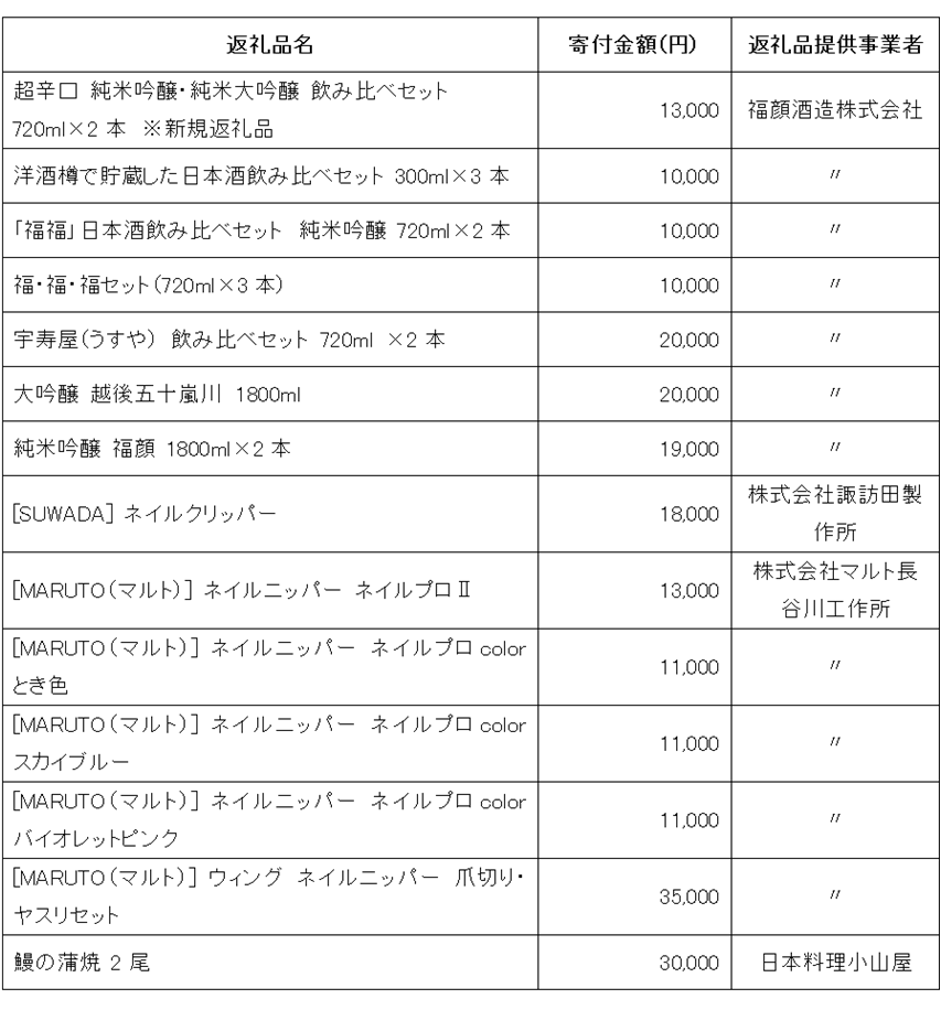 また、新規返礼品を含めた福顔酒造の返礼品のほか、爪切りやうなぎの蒲焼など合計14品について、各期限までに申込みいただければ、父の日までにお届けいたします。