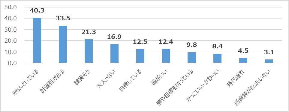 手帳を使っている/使っていないに関わらず、消費者全体に対して「手帳を使うこと」や「手帳を使う人」に対するイメージを聞いたところ、「きちんとしている(40.3%)」「計画性がある(33.5%)」「誠実そう(21.3%)」など、いずれも好意的なイメージが上位を占める結果となりました。【グラフ2】