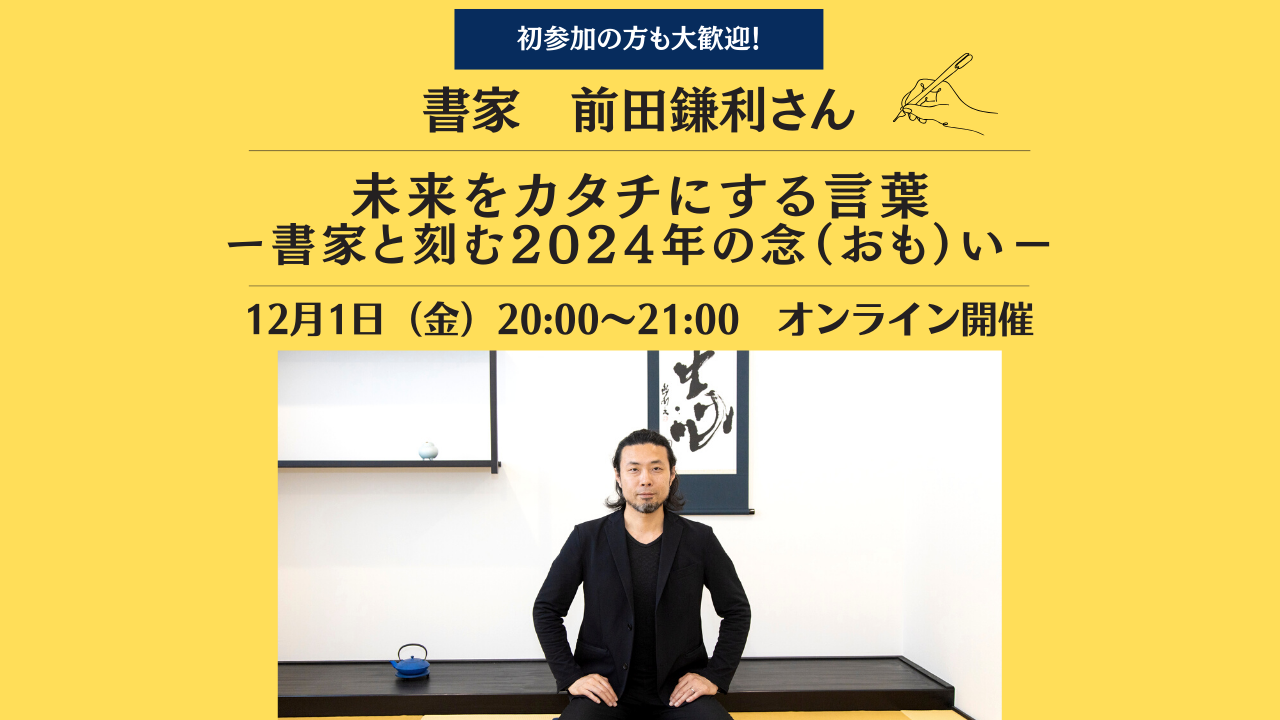 JMAMが運営するコミュニティサイト「時間〈とき〉ラボ」では、2023年12月1日“手帳の日”に、オンラインイベント“未来をカタチにする言葉-書家と刻む2024年の念(おも)い-”を開催します。イベントに書家兼プレゼンテーションクリエイターの前田鎌利氏を講師に迎え、前田氏の講演をお聞きいただいた後、一年内観と題して参加者一人ひとり2023年の振り返りと来年への想いを漢字一文字に記し、参加者同士でシェアをして来年への準備とするワークショップ型のイベントになります。