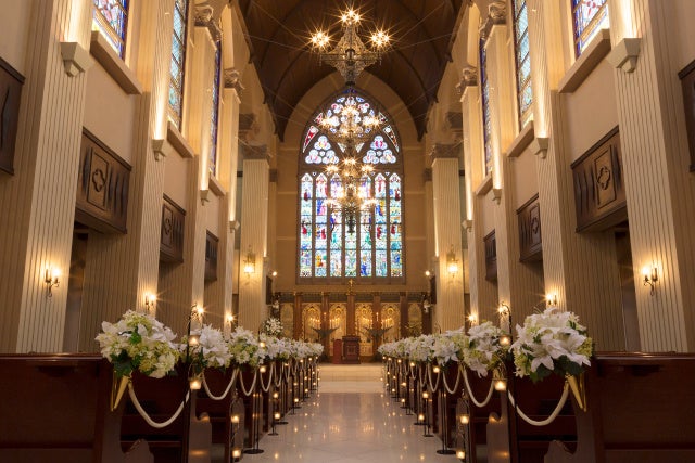 ブルーミントンヒルの大聖堂で本番同様の演出で行われる挙式をゲスト目線で体験。ベールやトレーンが美しく広がるバージンロードや光が差し込むステンドグラス、中庭で行うバルーンリリースなど本番さながらの挙式にご参加いただけます。おふたりの結婚式のイメージがよりリアルに。1日3回開催。