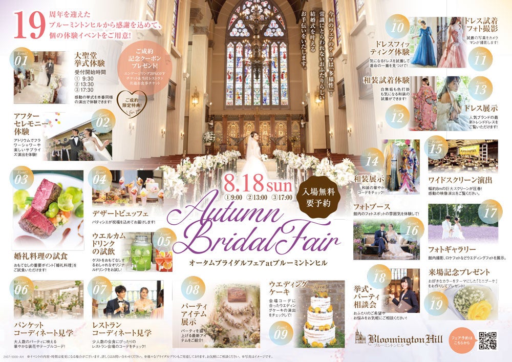 旭川市の結婚式場・ブルーミントンヒルでは半年に一度の、特別なブライダルフェアを8月18日(日)に開催します。19周年を迎えるブルーミントンヒルで憧れの結婚式をご体感いただける、このフェアだけの19の体験や展示をご用意しています。