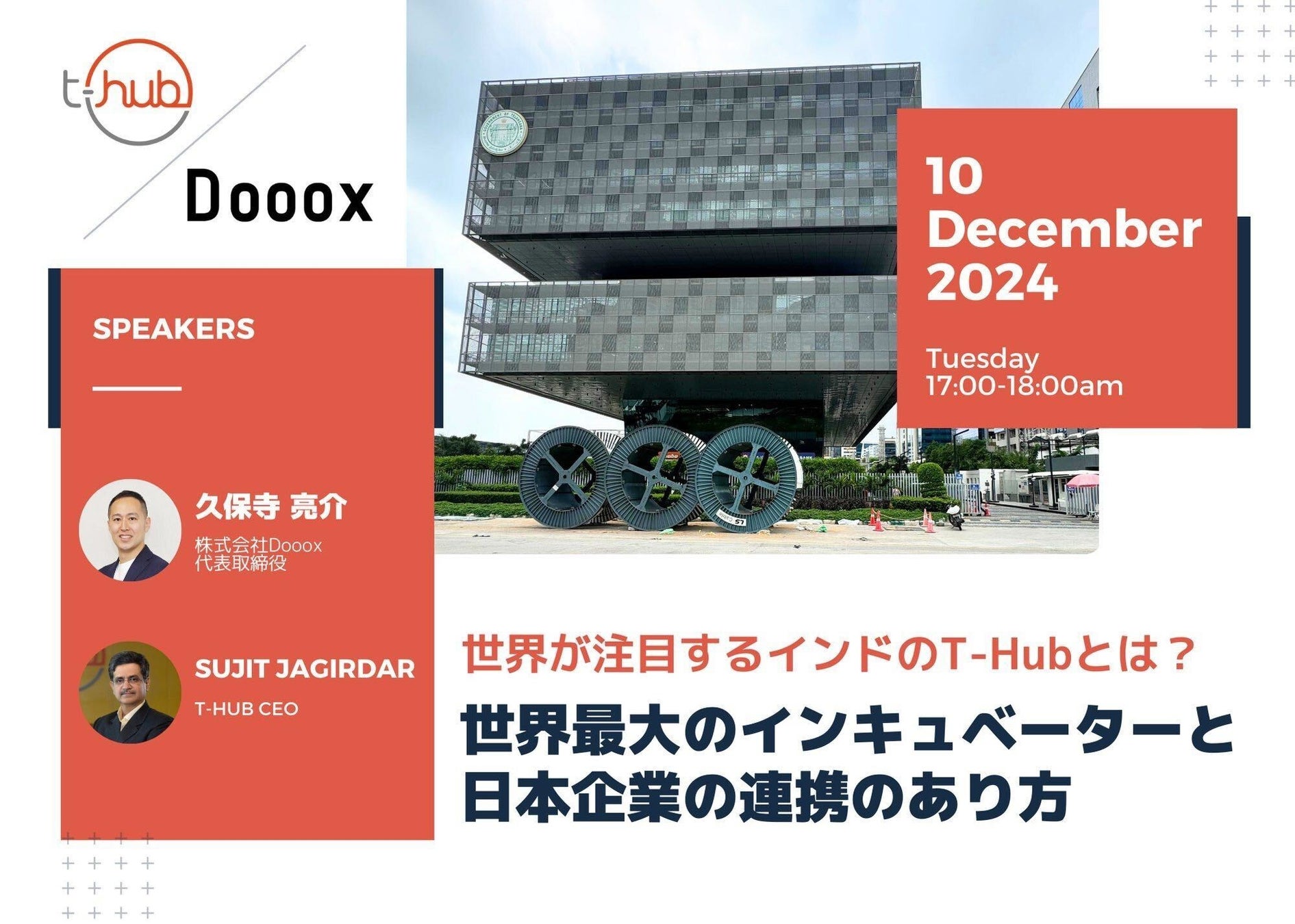 “行動で世の中を変えていく“を理念に掲げる株式会社Dooox(東京都千代田区、代表取締役 久保寺亮介/以下「当社」)は12月10日(火)17時より、インド・ハイデラバードの世界最大規模インキュベーション施設「T-Hub」との合同ウェビナーを開催いたします。