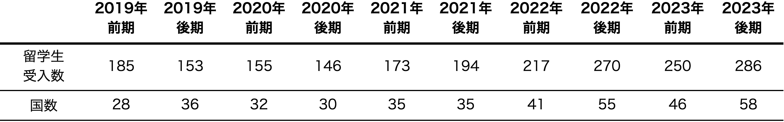 ※2020年前期から2021年後期までは、COVID-19による入国制限で、オンラインによる留学や、すでに国内に居住していた留学生のみ受入を行っていました。