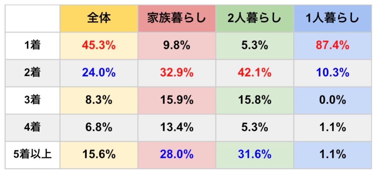 2人暮らしでは2着が約4割・5着以上が約3割