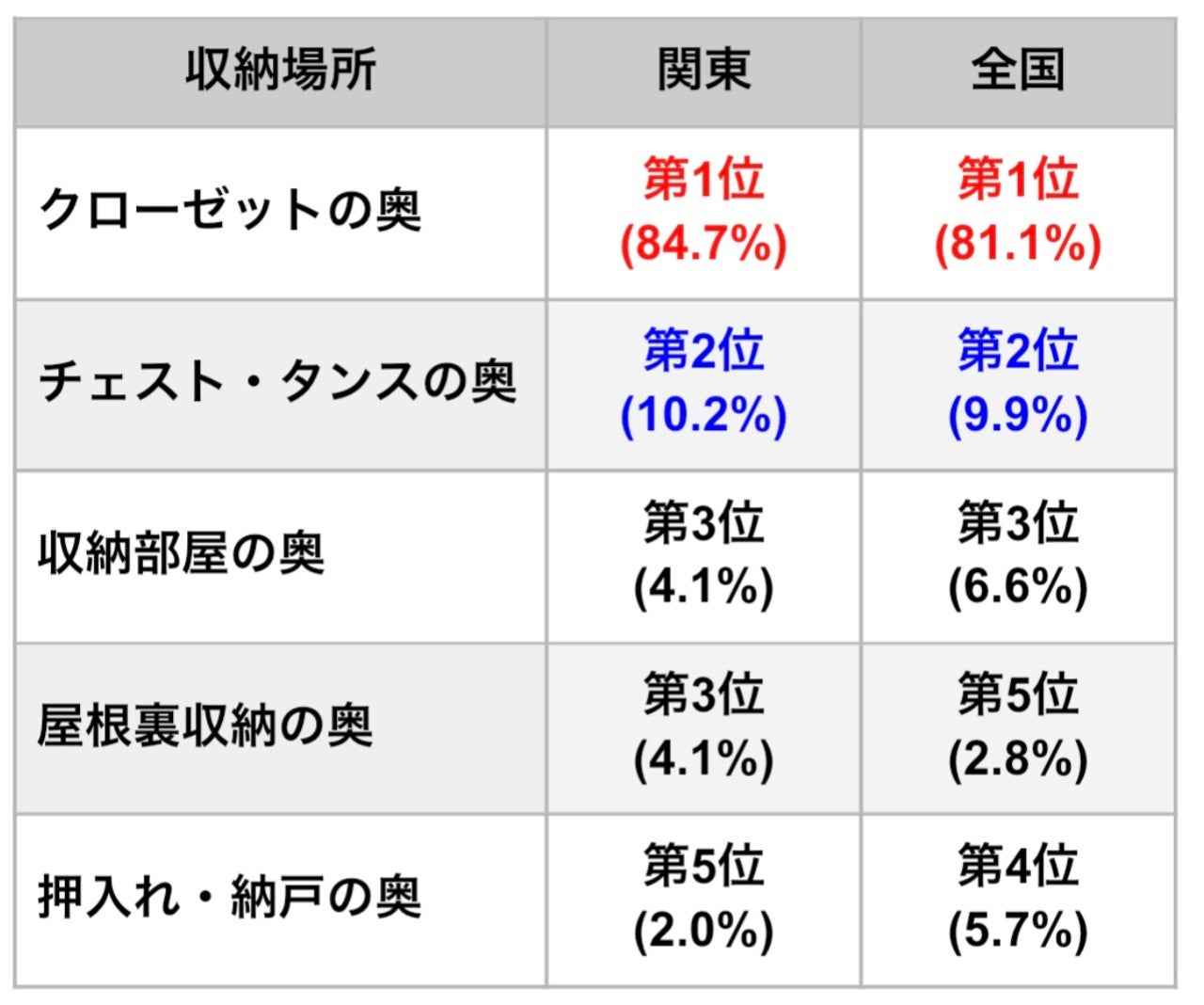 突出して多かったのは「クローゼットの奥」で8割以上でした。また、「チェスト・タンスの奥」がほぼ1割で、「収納部屋の奥」「屋根裏収納の奥」「押入れ・納戸の奥」がそれぞれ1割未満でした。どれも使用頻度が低いことで「奥の方にやっている」ことにより出し入れしにくいということが共通していました。