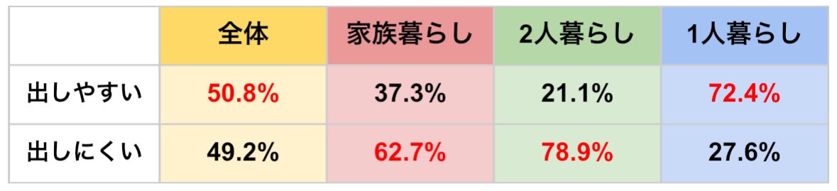 となっており、特に家族暮らし・2人暮らしにおいて「出しにくい」と答えた方が多いほか、関東では全国に比べ「出しにくい」と答えた方が家族暮らしでは6.6%・2人暮らしが15.1%多い結果でした。