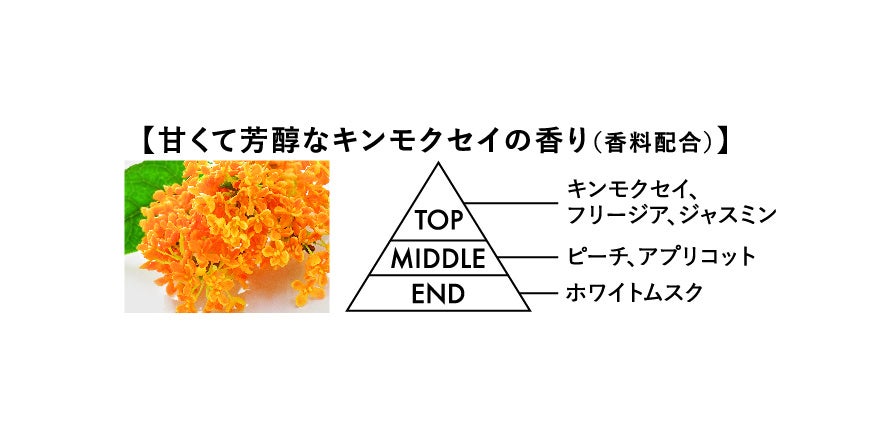 自然界に存在する、甘くて芳醇な金木犀の香りを、環境に配慮する形で再現しました。金木犀をはじめフリージアやジャスミンなど、心落ち着く香りの組み合わせで構成されています。