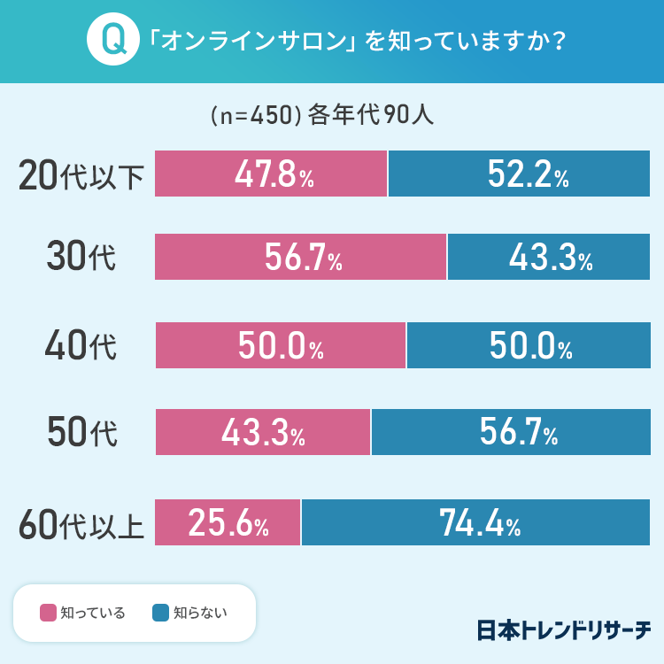 60代以上では、4人に1人の方がオンラインサロンを「知っている」ようです。