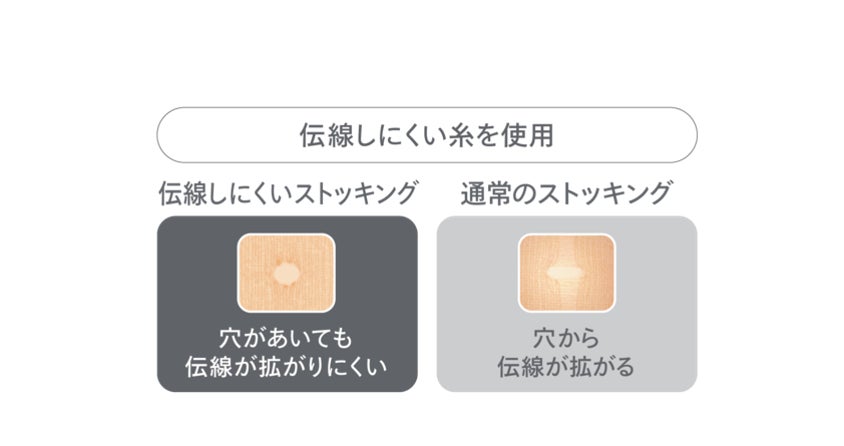 穴が開いても伝線が拡がりにくい糸のゾッキ編みを採用しています。生地面が美しく伸びがよく、肌にフィットする履き心地です。