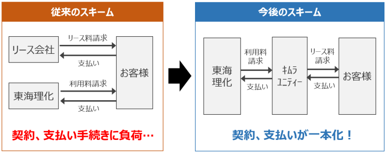 従来のスキームでは、リース車両にBqeyを導入する際、申し込み手続き、リース料・利用料の支払い、リース満了時の車両引揚げについて、契約窓口毎に対応する必要があり、お客様にとって業務負荷が重なるという声をいただいておりました。