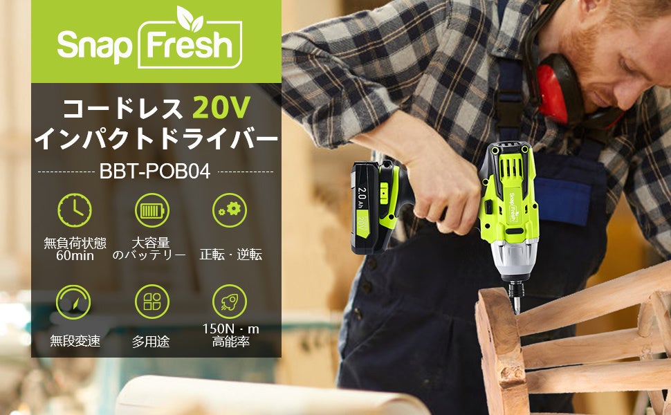 SnapFreshのインパクトドライバーは安定性に優れた回転軸でより高い作業効率を提供いたします。この軽量インパクトドライバーは使い勝手がとてもよいので、日曜大工や家具の組立て、自転車の整備など様々なシーンで大活躍します。