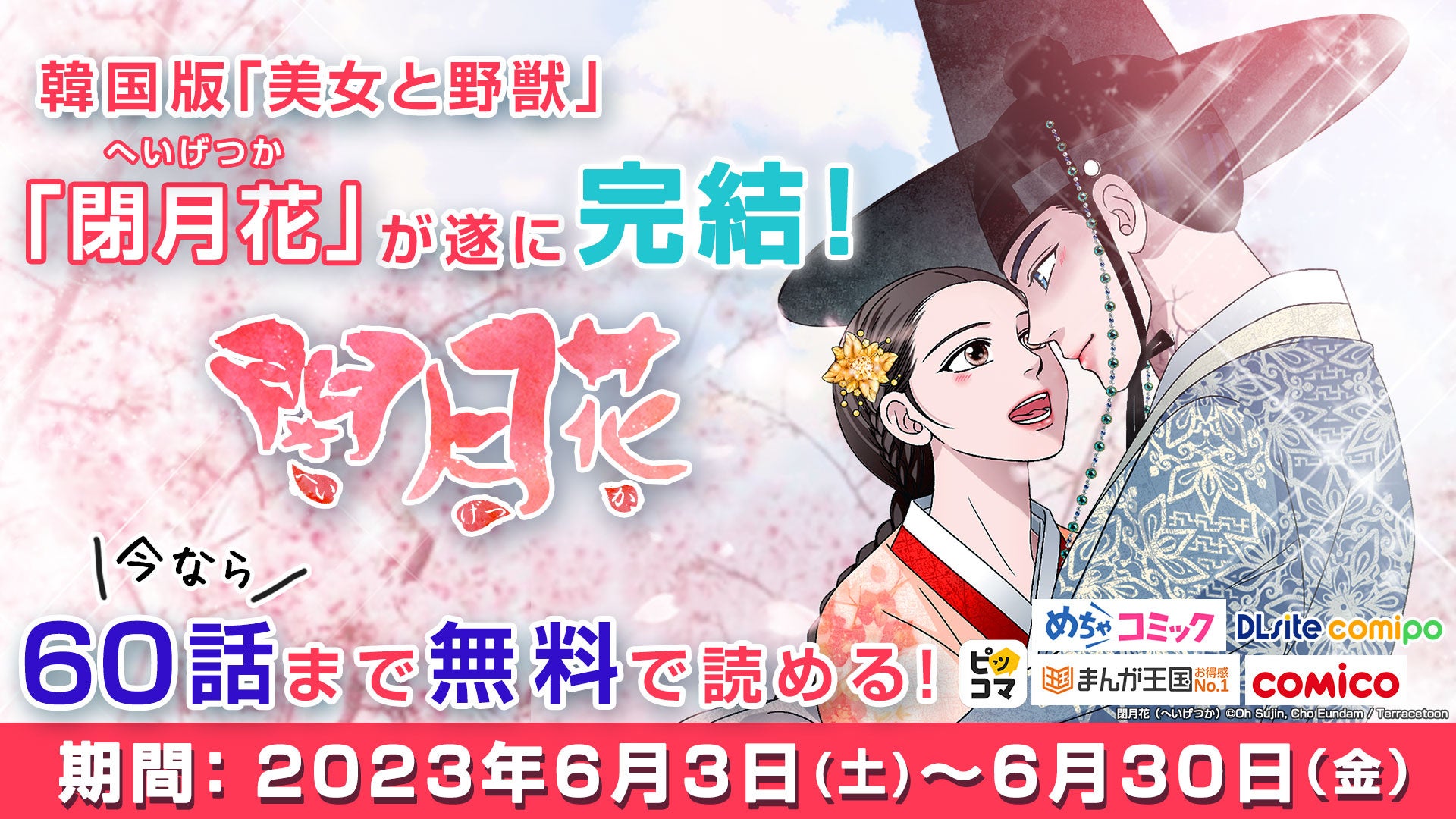この度は、そんな本作の華々しい完結を記念し「ピッコマ」、「comico」、「まんが王国」、「めちゃコミック(めちゃコミ)」、「DLsite comipo」にて好評連載中の『閉月花(へいげつか)』を通常3話まで無料のところ6月3日(土)から6月30日(金)の期間限定で誰でも60話まで無料でお楽しみいただけるキャンペーンを実施いたします。