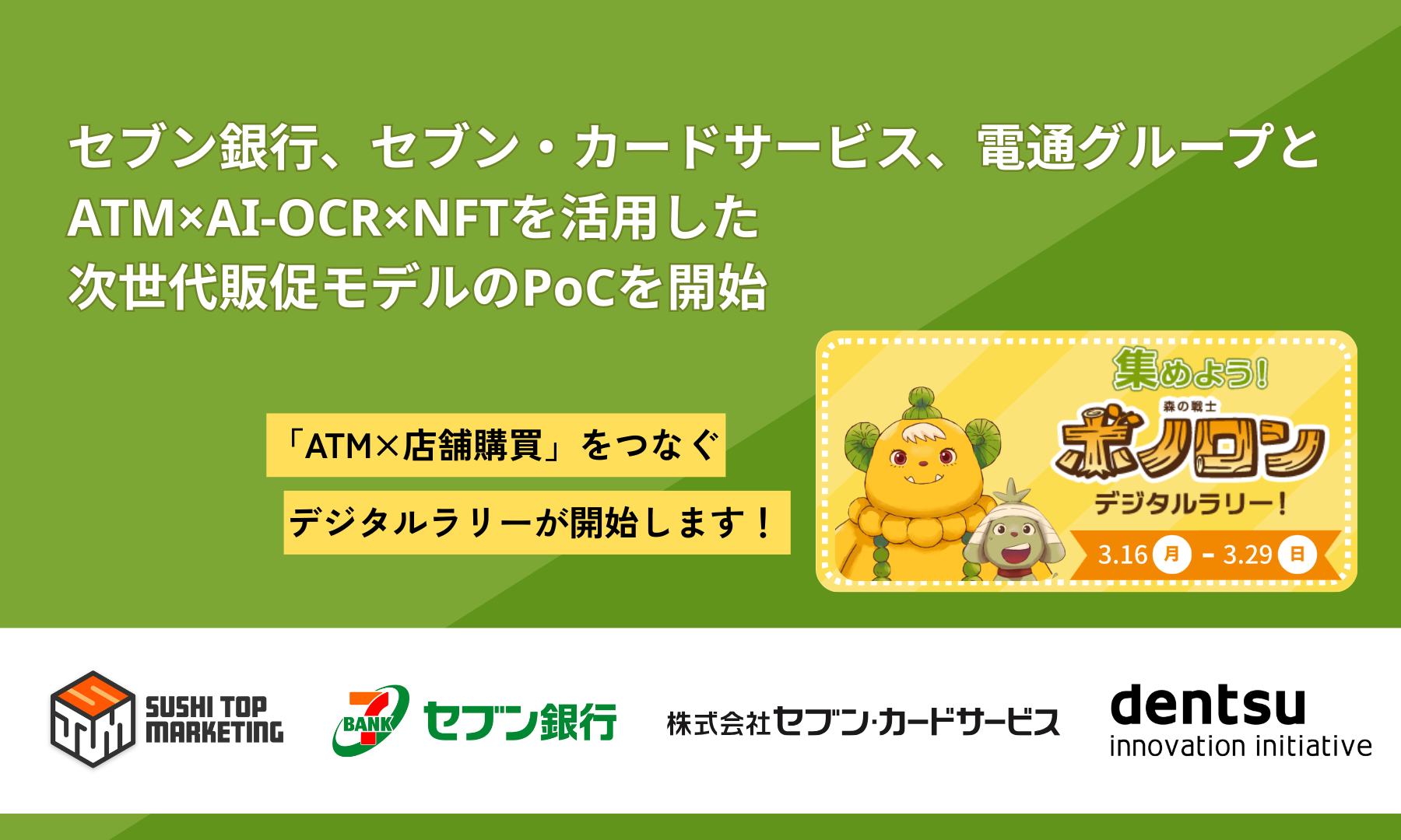 SUSHI TOP MARKETING株式会社(本社:東京都千代田区、代表取締役CEO:徳永 大輔、以下「当社」)は、株式会社セブン銀行(本社:東京都千代田区、代表取締役社長:松橋 正明、以下「セブン銀行」)、株式会社セブン・カードサービス(本社:東京都千代田区、代表取締役社長:竹内 洋、以下「セブン・カードサービス」)、株式会社電通グループ(本社:東京都港区、代表執行役 社長 グローバルCEO:五十嵐 博)のグループ横断R&D組織「電通イノベーションイニシアティブ」(以下「DII」)とともに、ATMにおける行動データと店頭の購買体験をAI-OCRとNFTで連携させ、点在していた顧客接点を横断的に捉えるための次世代販促モデルのPoCとして、販促キャンペーン「集めよう!森の戦士ボノロンデジタルラリー!」を2026年3月16日(月)より開始します。