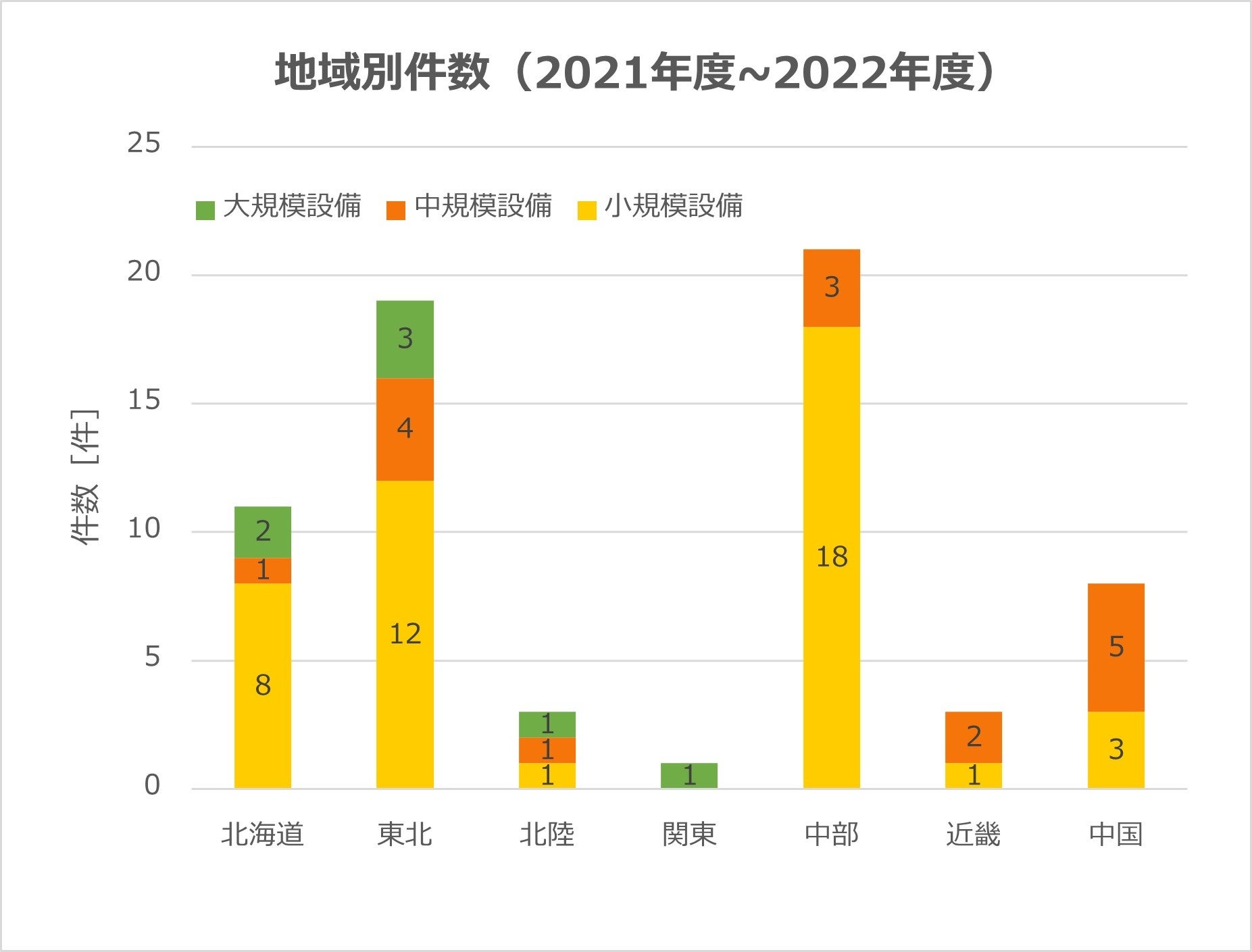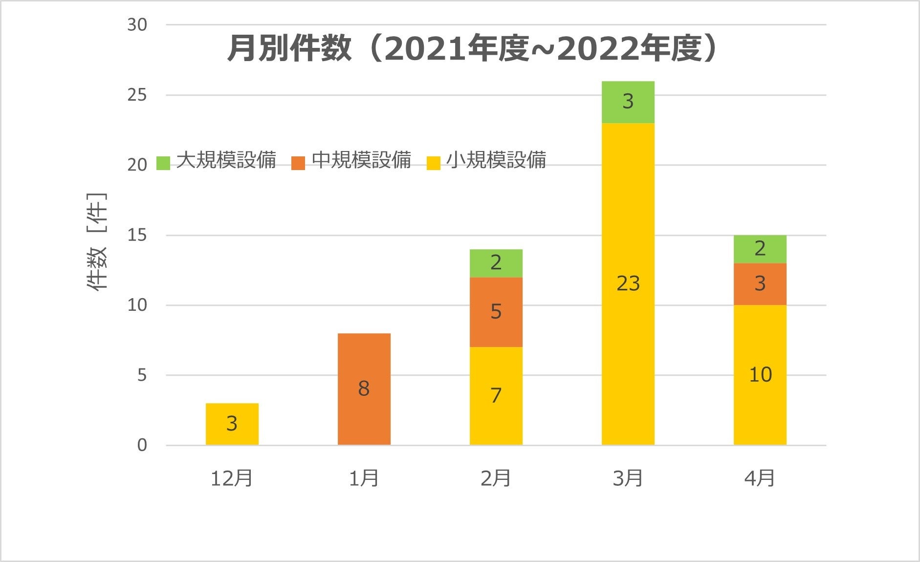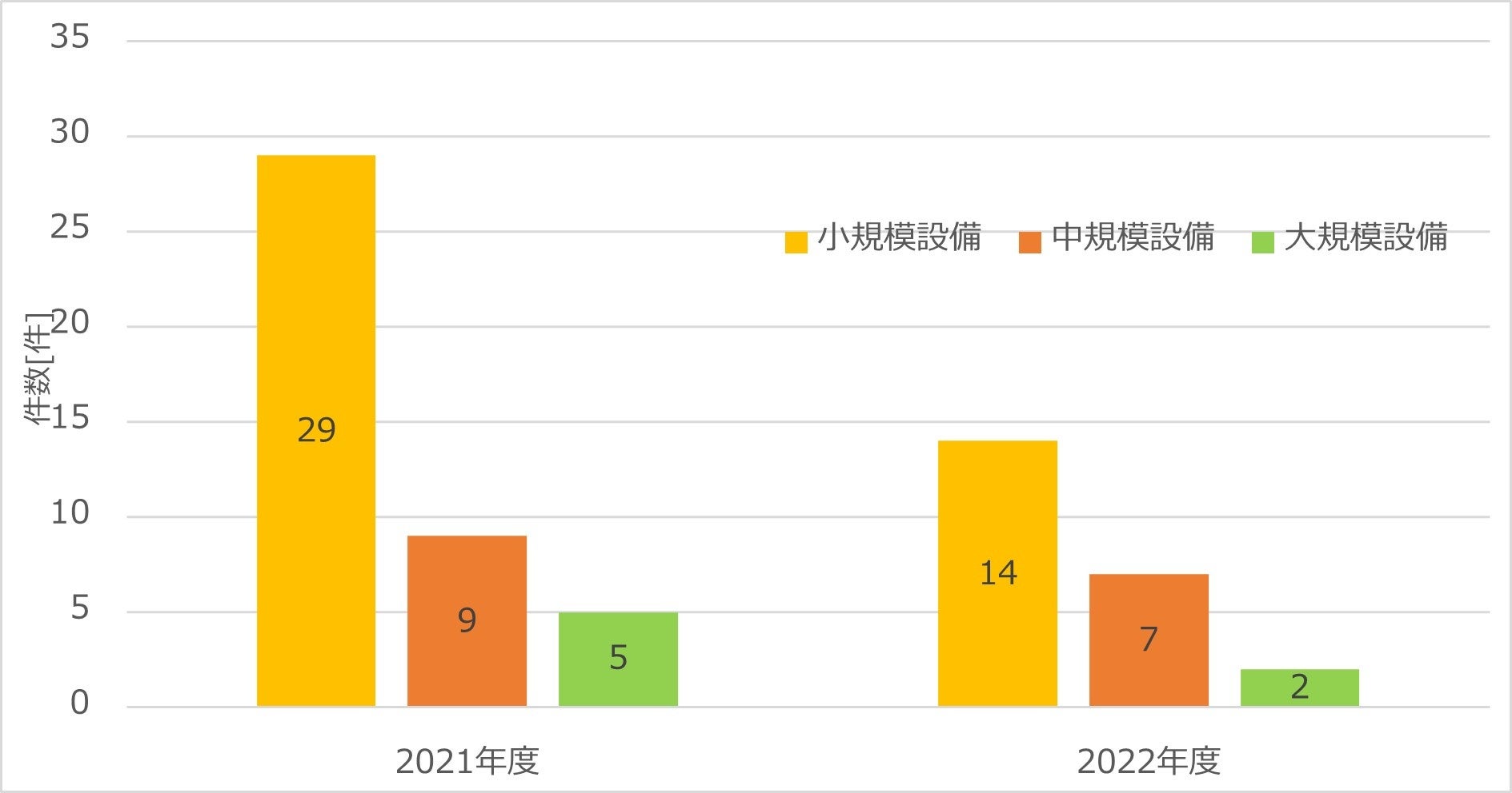 小規模設備の積雪による破損事故は、事故報告が義務化された2021年度では29件、2022年度は14件の計43件報告されています。同期間での中規模以上の設備の破損事故は計23件であり、小規模設備において約1.9倍の事故が報告されています。