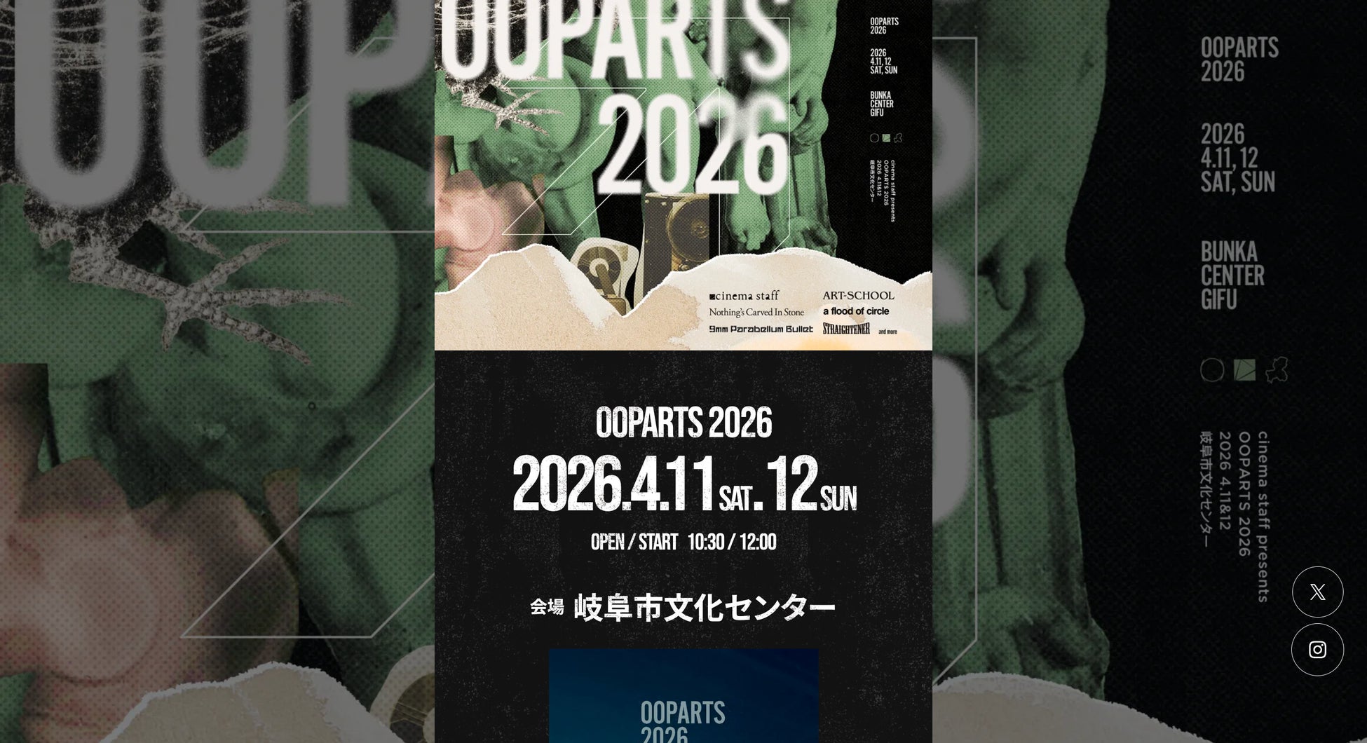 『OOPARTS 2026』は、2026年4月11日(土)・12日(日)の2日間、岐阜市文化センターにて開催予定。第1弾アーティストとして、9mm Parabellum Bullet、ストレイテナー、ART-SCHOOL、a flood of circle、Nothing’s Carved In Stone、cinema staff の6組が発表され、開催前から音楽ファンの間で大きな話題を呼んでいます。