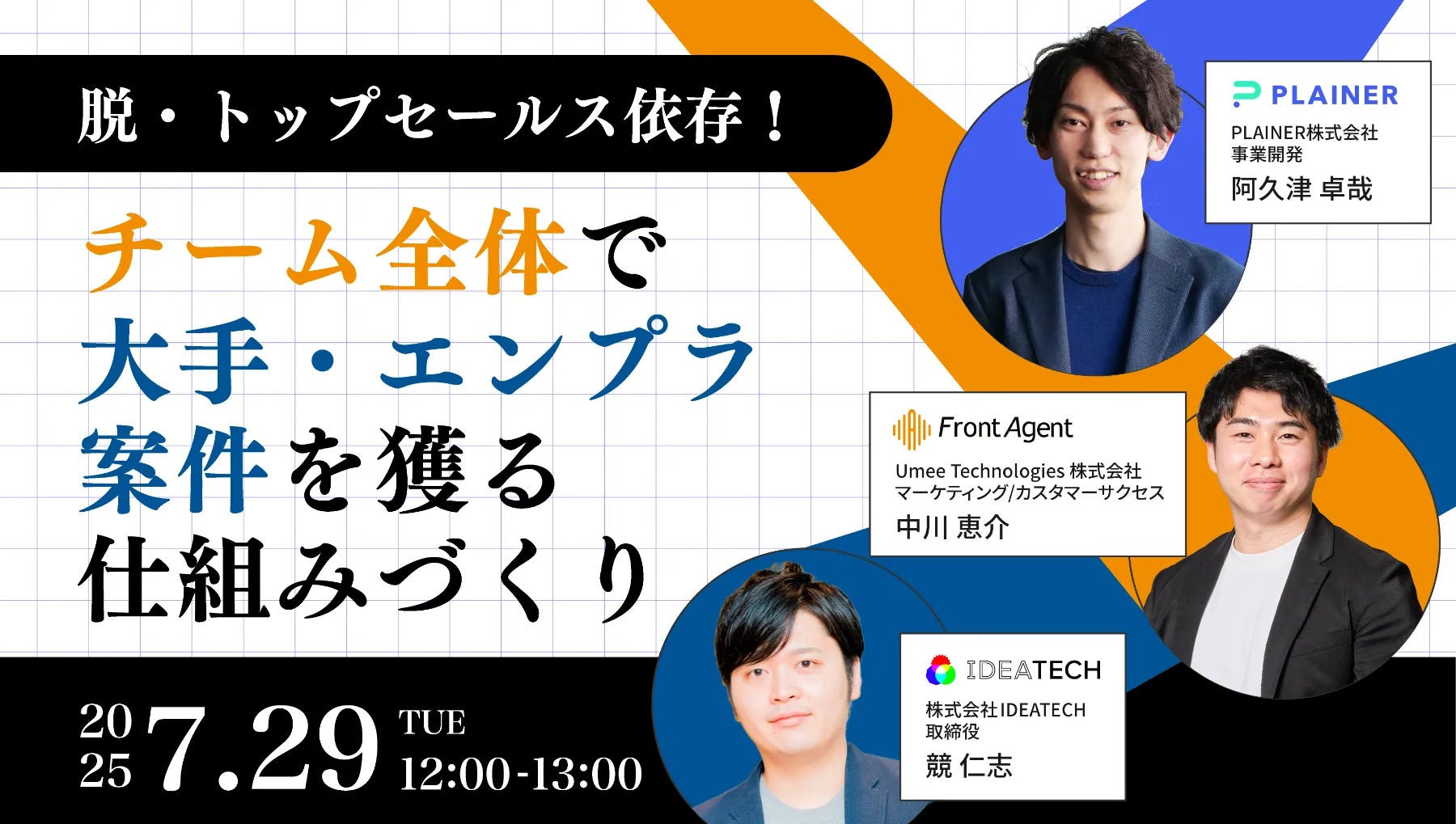 組織に進化をもたらす話術AI「Front Agent」を開発・提供するUmee Technologies株式会社(本社:東京都調布市、代表取締役:新納 弘崇、以下「ユミー」)は、PLAINER株式会社(本社:東京都渋谷区、代表取締役:小林 大、以下「PLAINER」)、株式会社IDEATECH(本社:東京都港区、代表取締役社長:石川友夫、以下「IDEATECH」)と、7月29日(火)12:00 - 13:00に共催オンラインセミナー、「脱・トップセールス依存!チーム全体で大手・エンプラ案件を獲る仕組みづくり」を開催いたします。