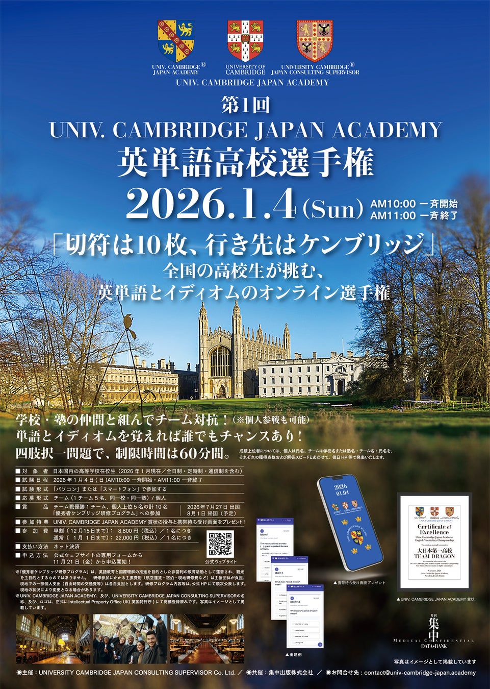 集中出版株式会社は、UNIVERSITY CAMBRIDGE JAPAN CONSULTING SUPERVISOR Co. Ltd. と共催で、現役高校生を対象とする全国規模のオンライン選手権「第1回 UNIV. CAMBRIDGE JAPAN ACADEMY 英単語高校選手権」を2026年1月4日(日)に開催します。