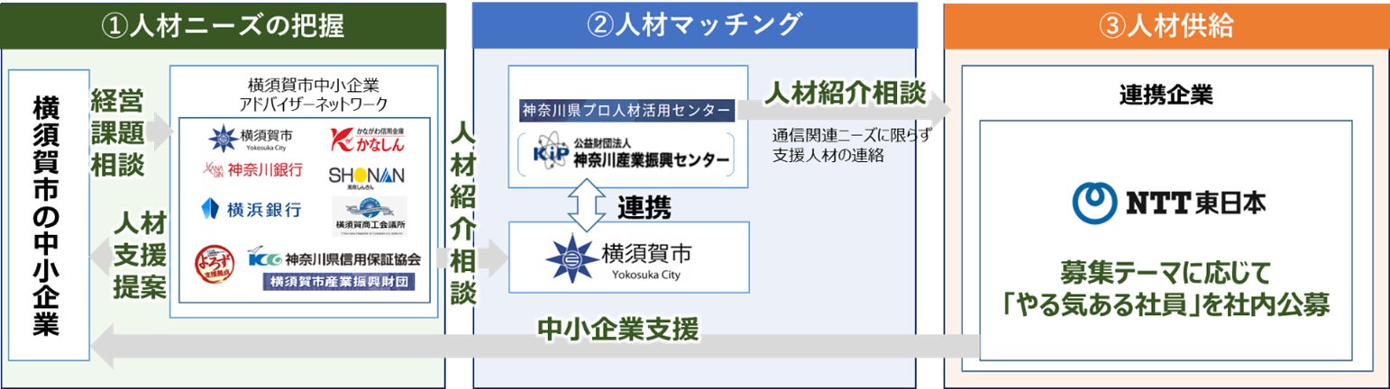 ・神奈川県プロ人材活用センターが中小企業の経営課題をヒアリング、募集人材を明確にし、NTT東日本等の横須賀に拠点を置く企業や民間副業人材マッチングサイトへ誘導・照会