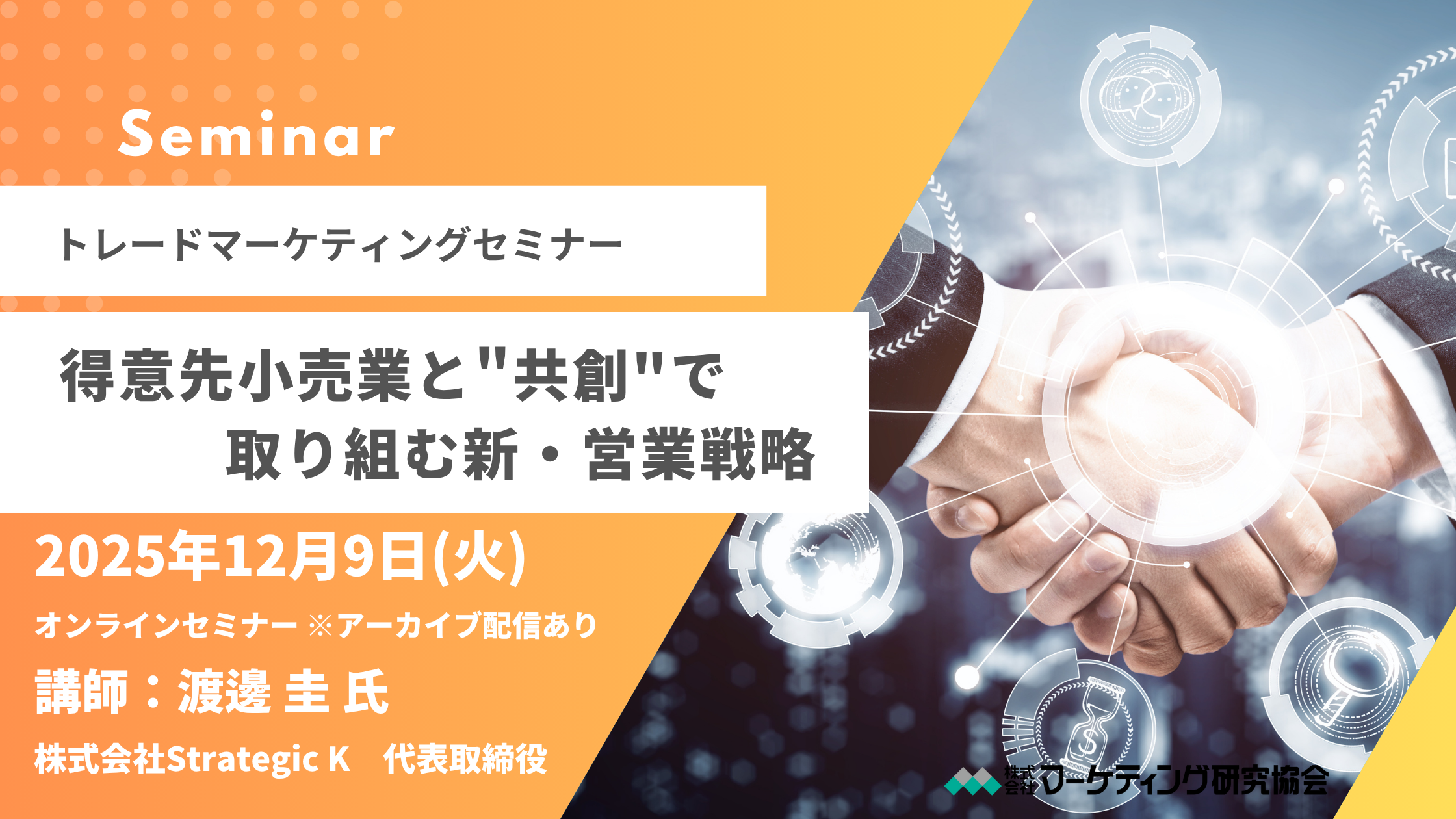 株式会社マーケティング研究協会は2025年12月9日「得意先小売業と"共創"で取り組む新・営業戦略~CSVをメーカーの営業現場で体現する方法とステップ~」を開催します。アーカイブ配信あり。