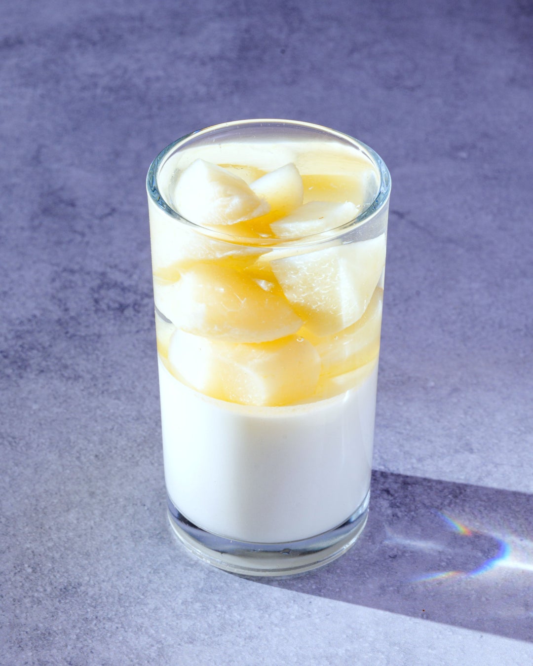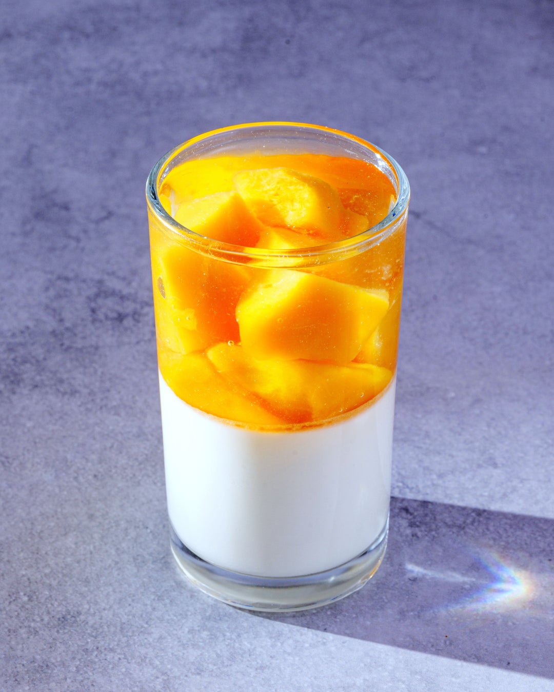 マンゴーや桃、シャインマスカットなど、旬の果実をぎゅっととじ込めたゼリーを、口当たりなめらかな能登ミルクのブランマンジェに重ねました。大きめにカットしたみずみずしい旬果のごろっとした果実味と華やかな彩り、そして見た目の涼やかさを兼ね備えた、夏にぴったりの上質なスイーツです。