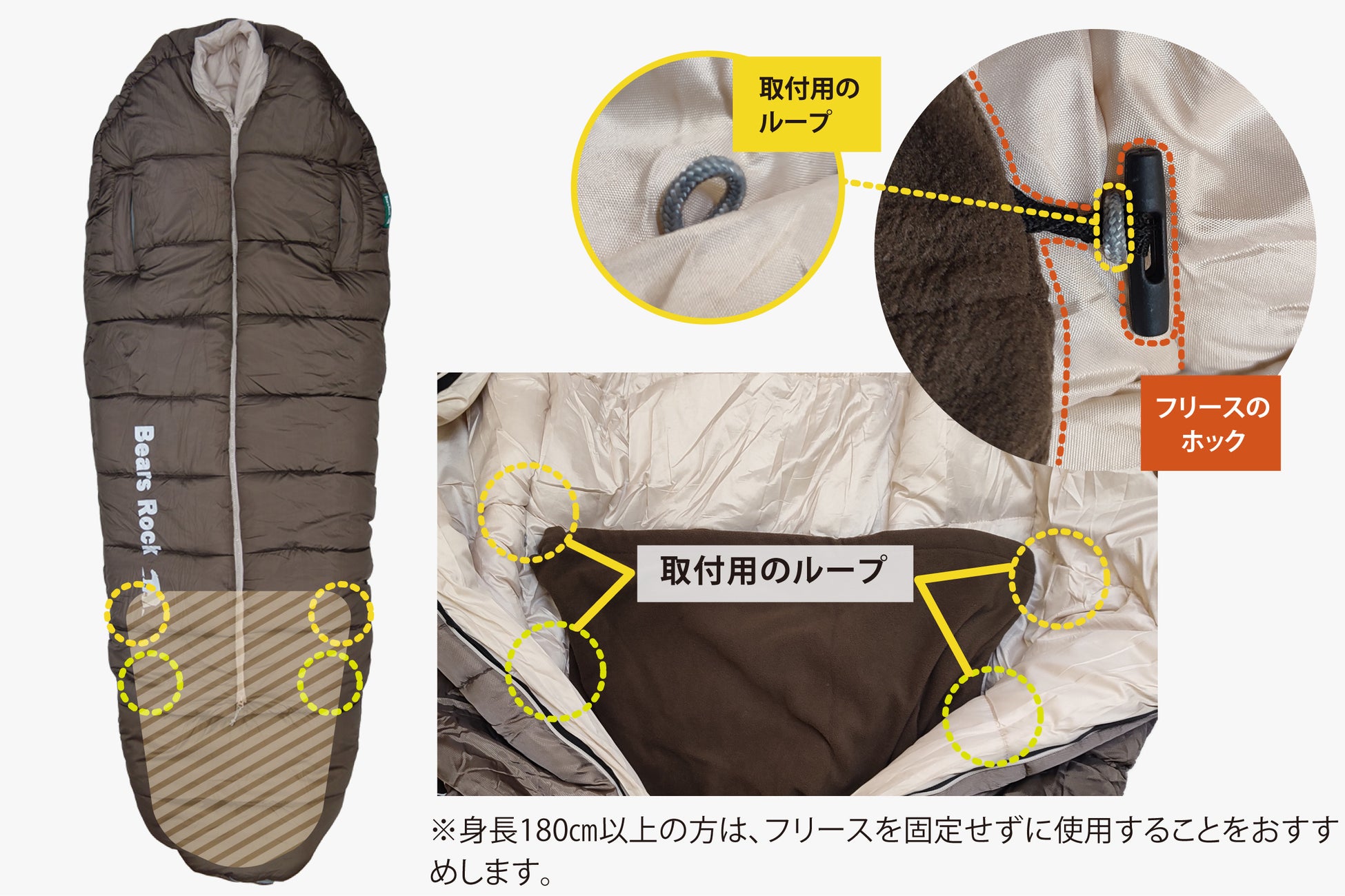-34℃センタージッパー寝袋には、フリース取付用のループ(フリースに付いているホックをかける場所)が2段階で付いているので、体の大きさに合わせて取り付けることができます。