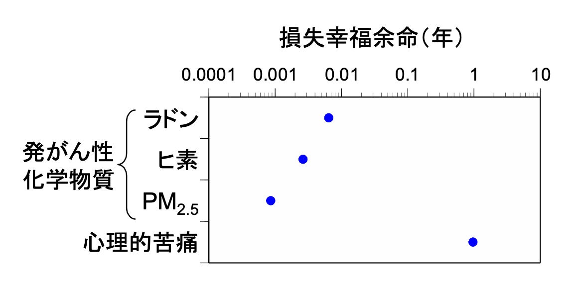 損失幸福余命とは、幸福余命(幸福な気分で過ごす余命の長さ)の一人あたりの平均的な短縮時間を指し、リスク事象に伴う幸福度の低下と死亡率の増加の両者を組み合わせて計算されるもので、質の異なる多様なリスク事象の大きさを比較することができます。本研究によって、初めて発がん性化学物質の損失幸福余命が算出されました。
