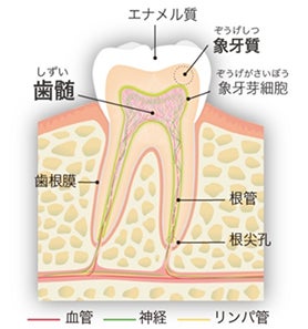歯髄は歯の中心部に存在し、神経のほか、血管やリンパ管が集合した組織です。歯に水分や栄養を届ける働きや、歯の内部への細菌侵入を防ぐ働き、傷ついた歯の硬組織(象牙質)を修復する働きなど、歯を健康に保つ上で重要な役割を担っています。