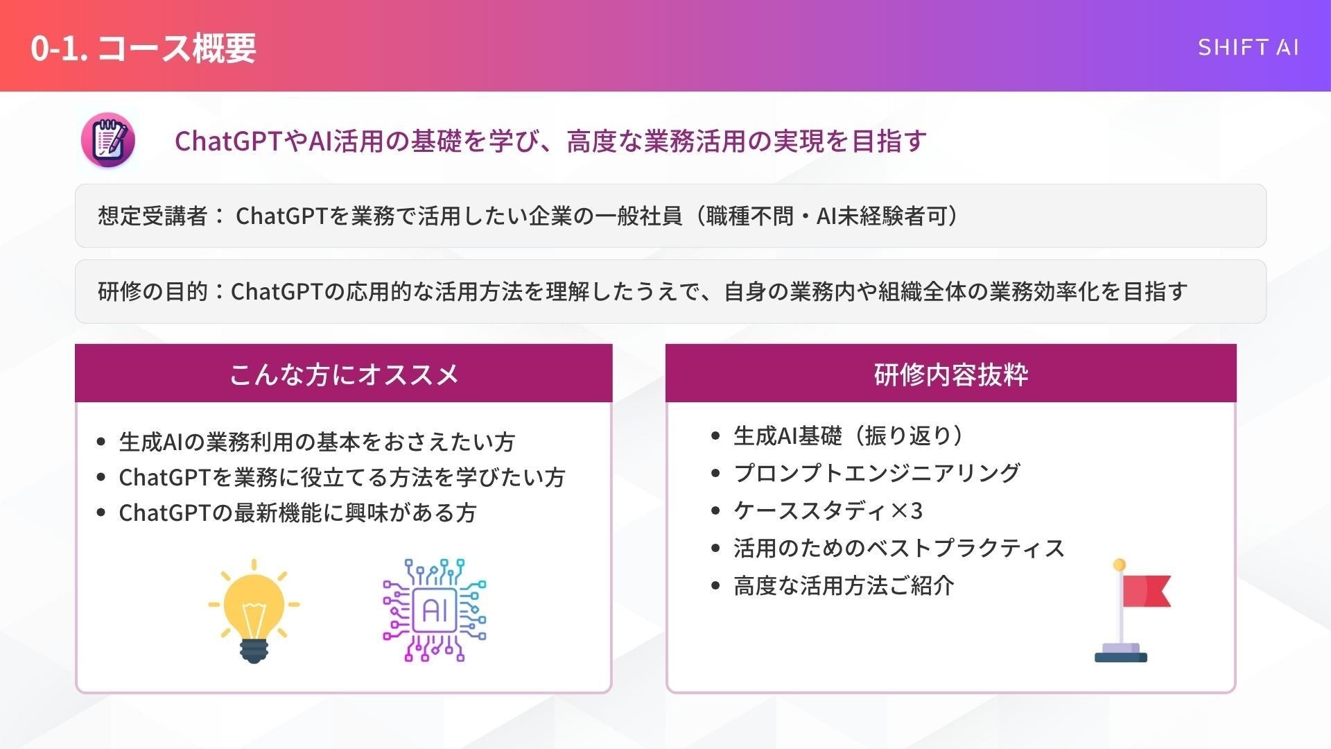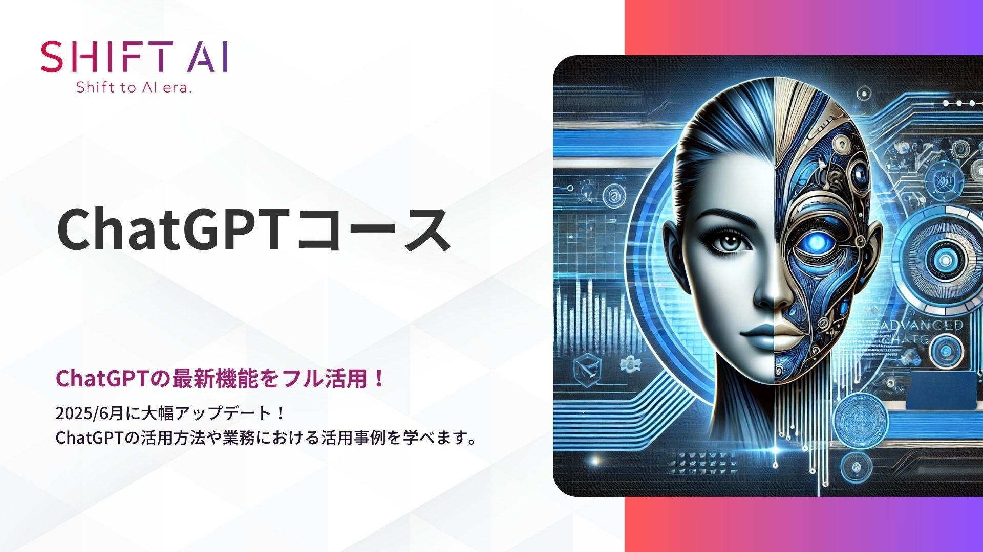 「日本をAI先進国に」を掲げAIのビジネス活用を学べる利用者数No.1※のAI大学「SHIFT AI」を運営する株式会社SHIFT AI(東京都渋谷区、代表取締役 木内翔大、以下 当社 )は、法人向け新サービス「ChatGPTコース」を2025年6月3日よりアップデートしました。