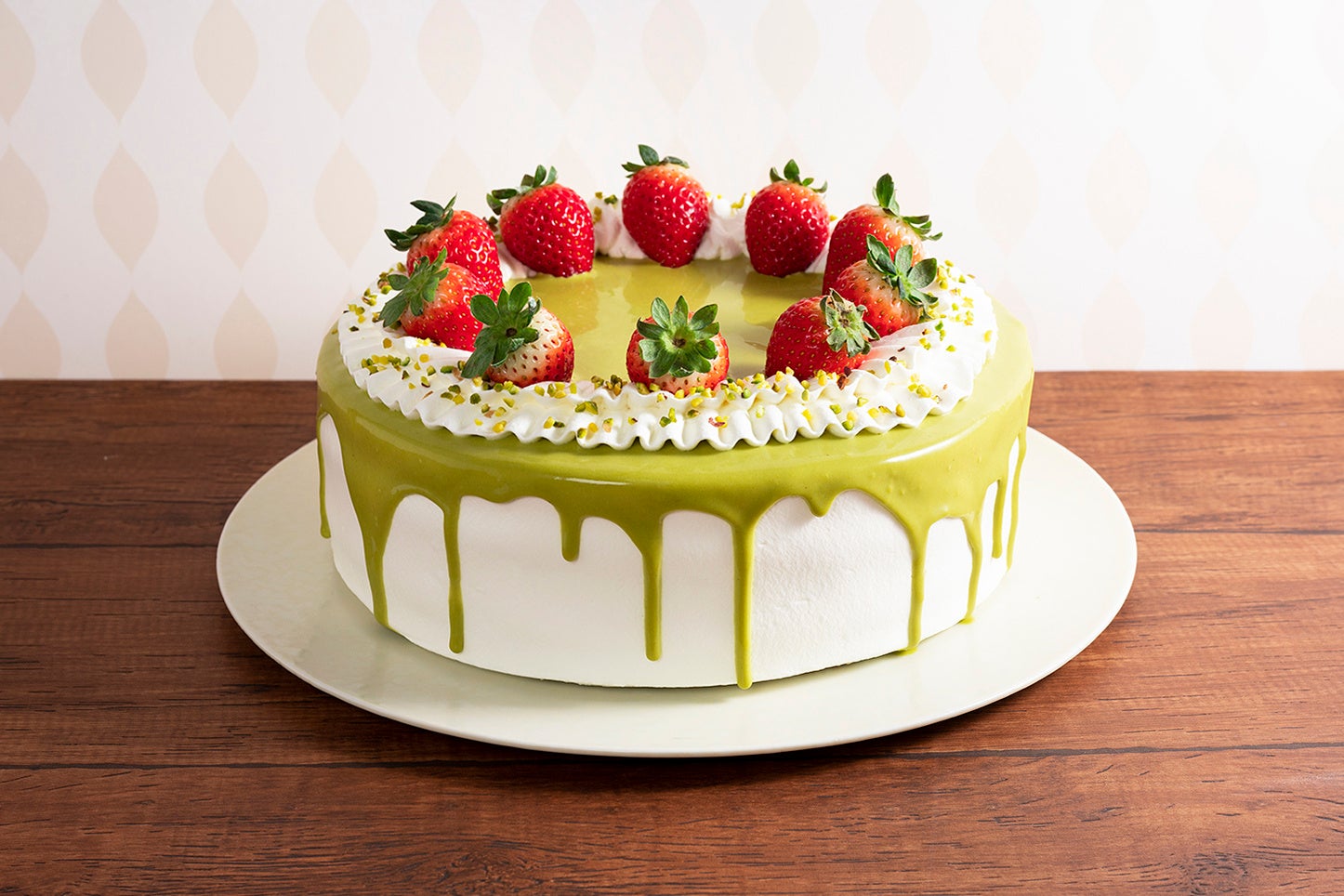 とろりと掛けた艶のあるグリーンが目を惹くピスタチオソース、鮮やかな苺がクリスマスシーズンにぴったりの華やかなショートケーキ。
