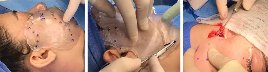 Formlabsの滅菌ガイドラインに従って滅菌した手術用ガイドを患者の顔面に装着し、脂肪を注入すべき位置をマーキングします。その後、計測した脂肪量を基に、正確な体積の脂肪を注入します。