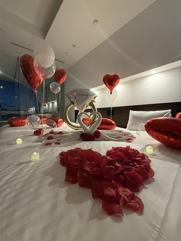 赤いバルーンやフラワーとともに、客室全体がサプライズ感あふれるロマンチックな空間に。