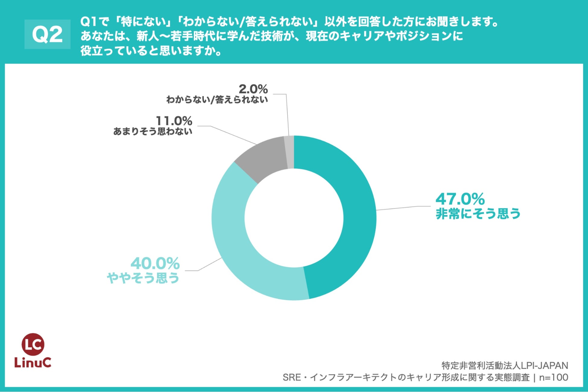 「Q2. Q1で「特にない」「わからない/答えられない」以外を回答した方にお聞きします。あなたは、新人~若手時代に学んだ技術が、現在のキャリアやポジションに役立っていると思いますか。」(n=100)と質問したところ、「非常にそう思う」が47.0%、「ややそう思う」が40.0%という回答となりました。