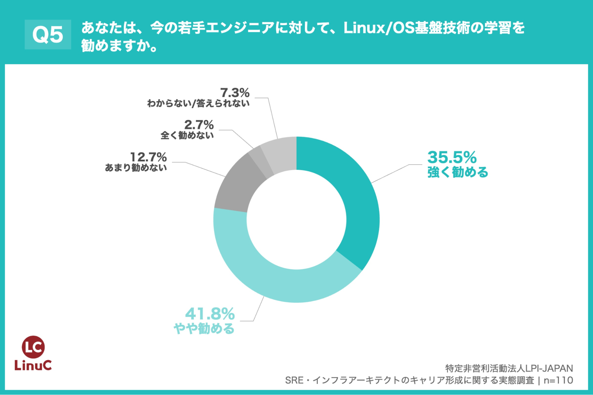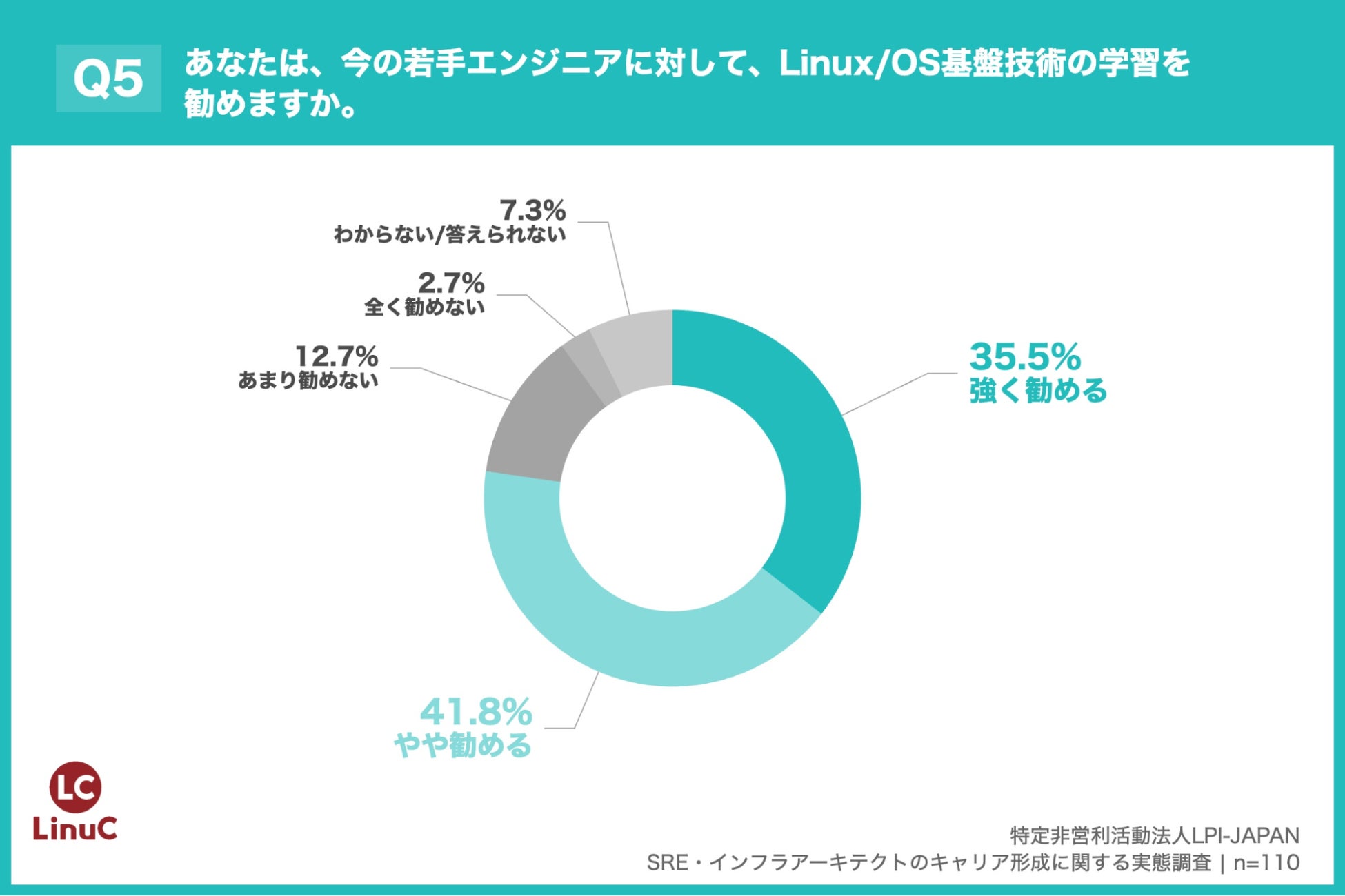 「Q5. あなたは、今の若手エンジニアに対して、Linux/OS基盤技術の学習を勧めますか。」(n=110)と質問したところ、「強く勧める」が35.5%、「やや勧める」が41.8%という回答となりました。