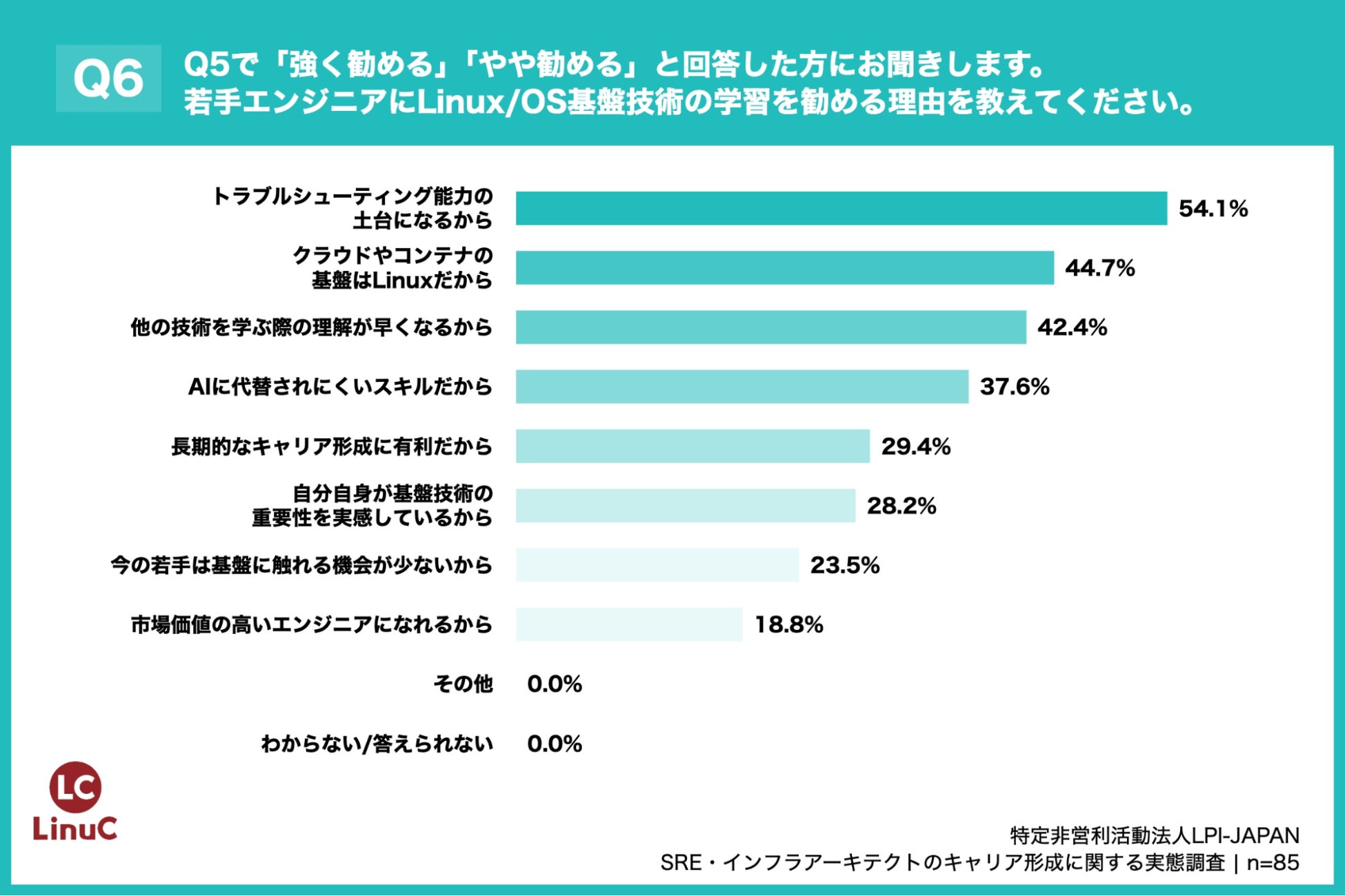 「Q6. Q5で「強く勧める」「やや勧める」と回答した方にお聞きします。若手エンジニアにLinux/OS基盤技術の学習を勧める理由を教えてください。(複数回答)」(n=85)と質問したところ、「トラブルシューティング能力の土台になるから」が54.1%、「クラウドやコンテナの基盤はLinuxだから」が44.7%、「他の技術を学ぶ際の理解が早くなるから」が42.4%という回答となりました。