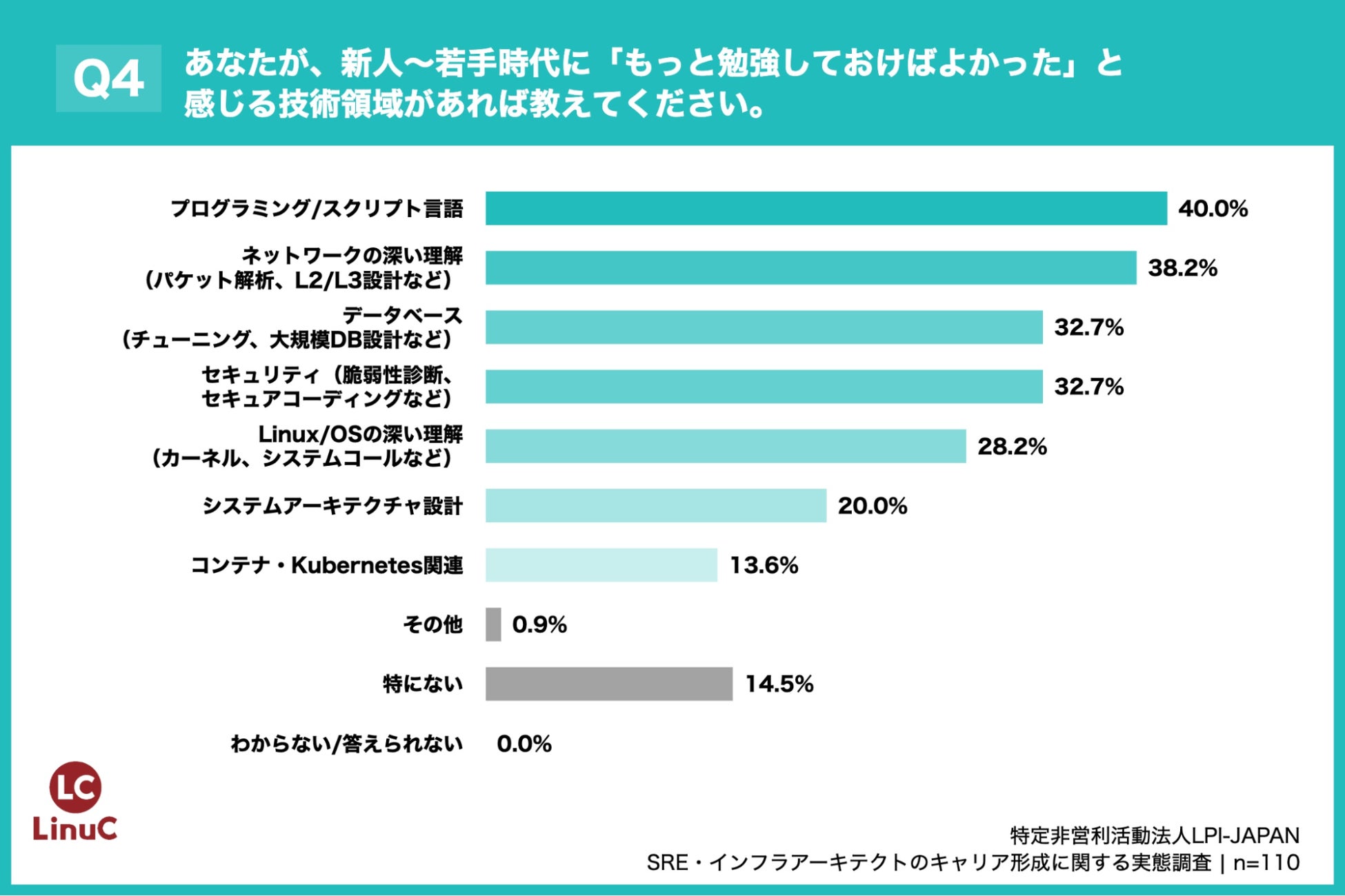 「Q4. あなたが、新人~若手時代に「もっと勉強しておけばよかった」と感じる技術領域があれば教えてください。(複数回答)」(n=110)と質問したところ、「プログラミング/スクリプト言語」が40.0%、「ネットワークの深い理解(パケット解析、L2/L3設計など)」が38.2%、「データベース(チューニング、大規模DB設計など)」が32.7%という回答となりました。